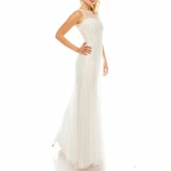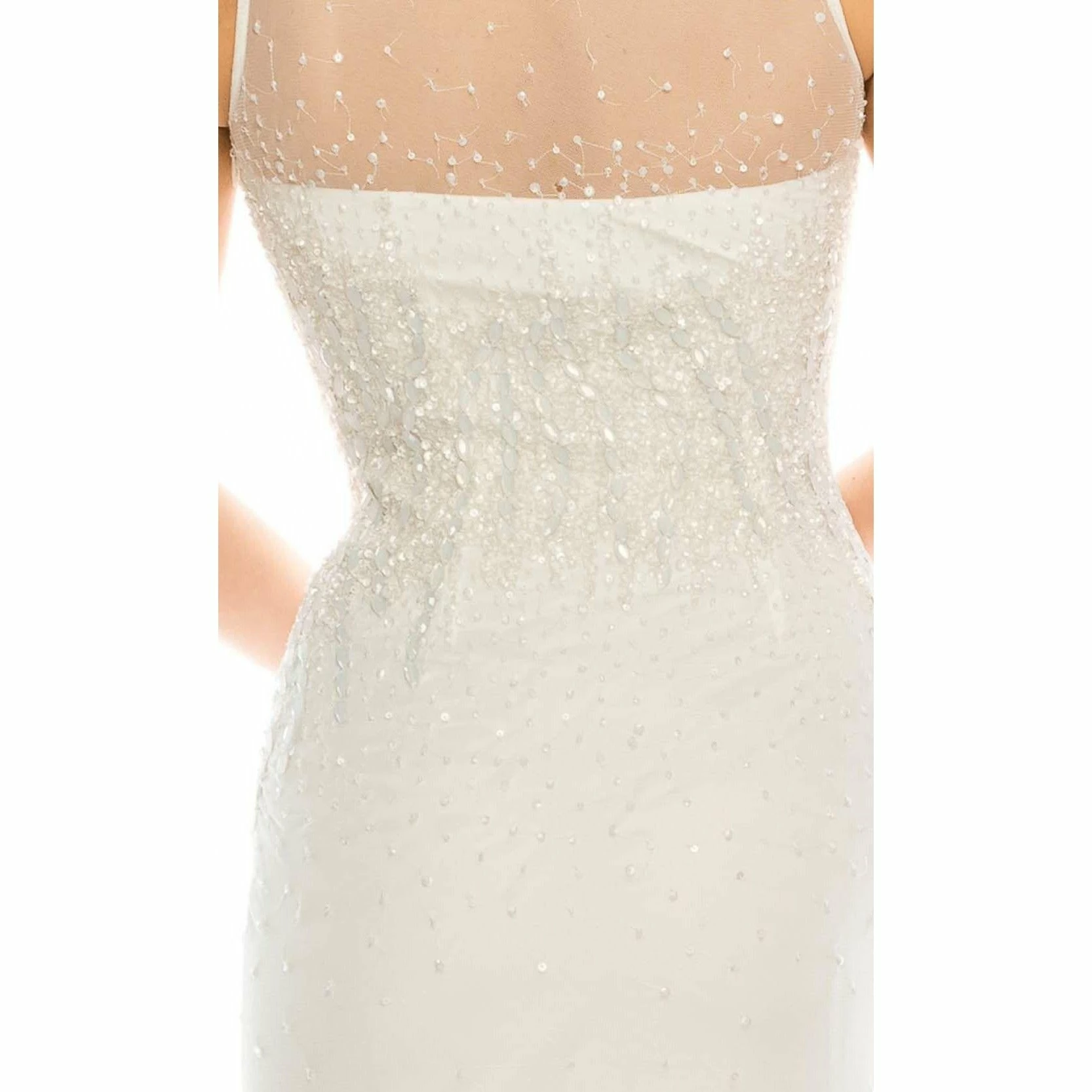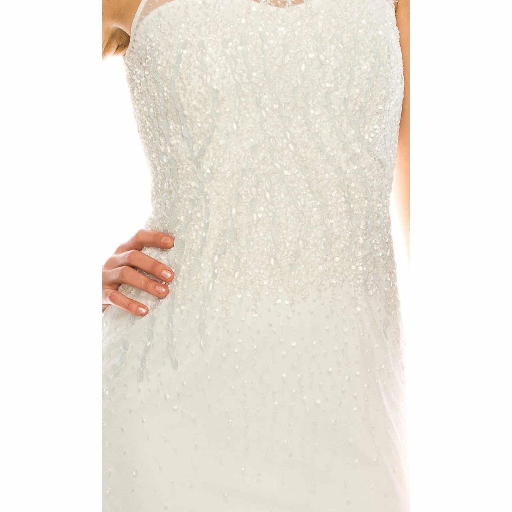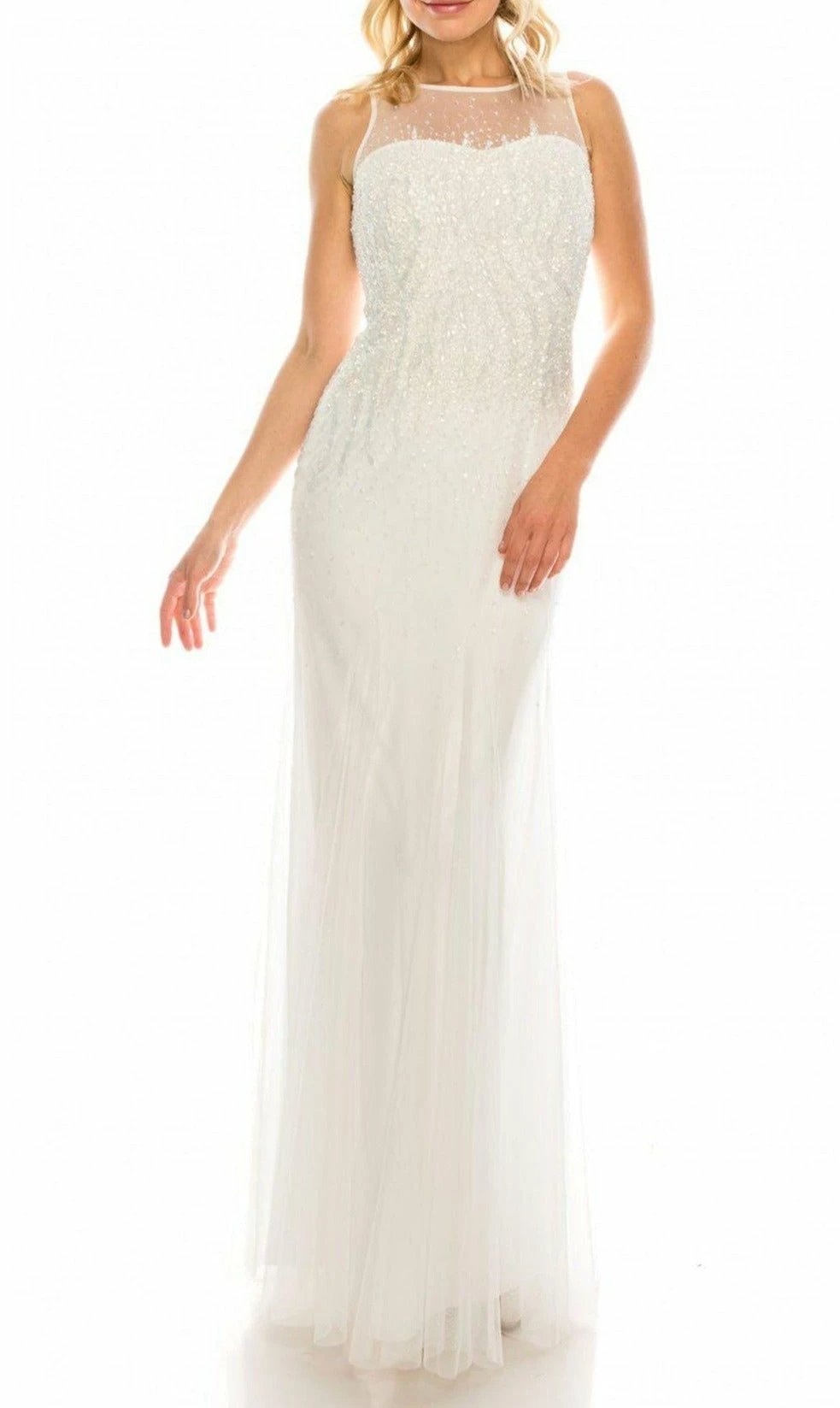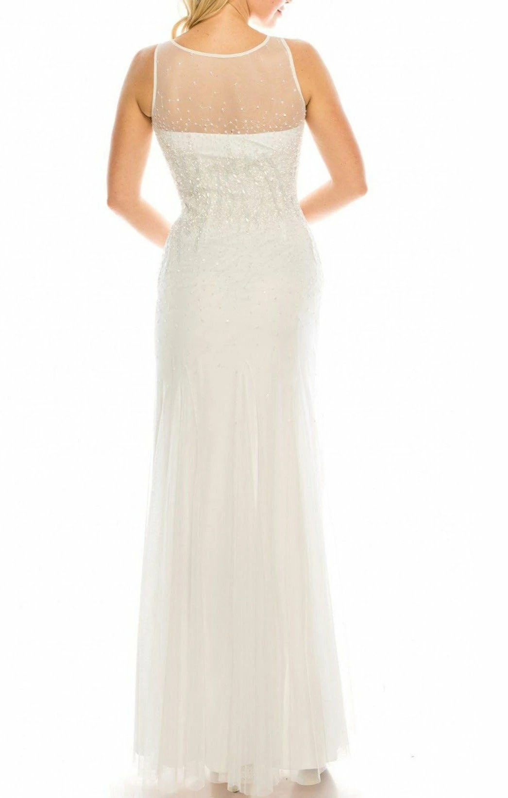 Enter the hall with grace and beauty in Adrianna Papell. This ivory breathtaking mesh features a divine illusion neckline, heavily intricate beading of the bodice, and sheath skirt. Turn yourself into a timeless beautiful goddess in this creation by Adrianna Papell.