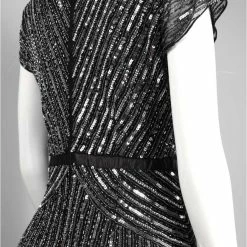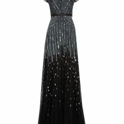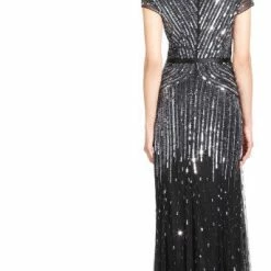 Perfect for your next occasion, this stunning sequined cap-sleeve bodice gives way to a gracefully flared skirt.