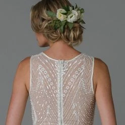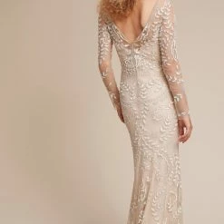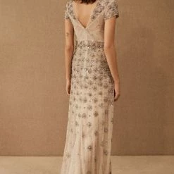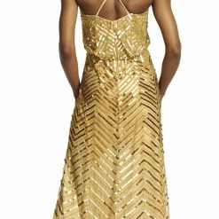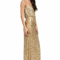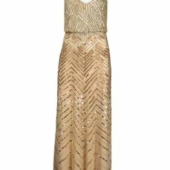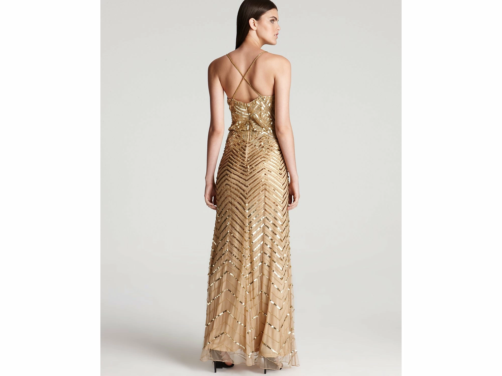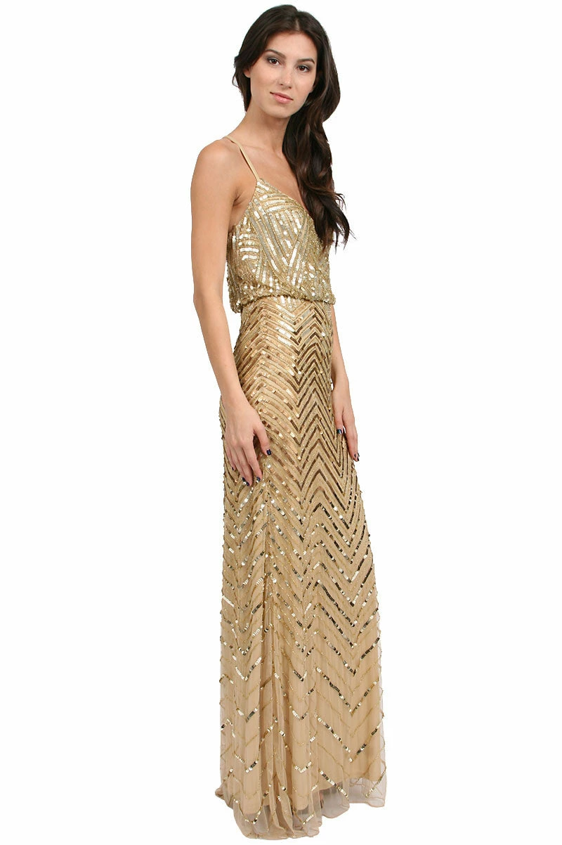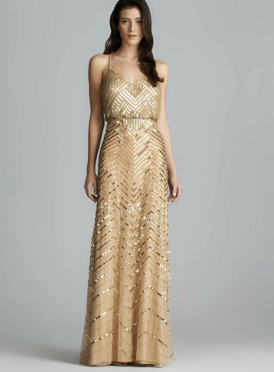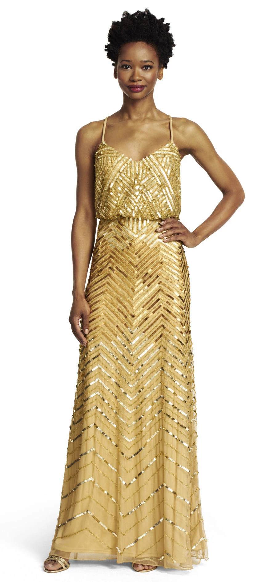 Get the gilded look in a gown that demands attention! Adrianna Papell’s formal dress features a modern blouson silhouette bedecked with beads and sequins for an on-trend yet classic style. Â This dress is a stunning bridesmaid dress or is perfect for any special occasion! Â Brilliant beads light up this stunning beaded blouson gown, creating an unforgettable look. A glistening sequin-and-bead chevron pattern facets the flowing mesh of a cross-back blouson gown for a luminous finish.
