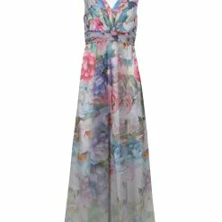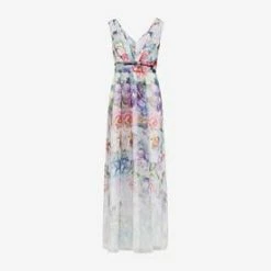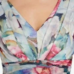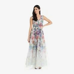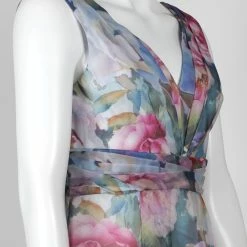 This beautiful floral dress features a draped, sleeveless bodice with v-neckline, a long, full A-line skirt, and a v-back with a back zipper closure. A dress this bold was made for drama. Rock this stunning special occasion dress to your next formal event to turn heads all night. Pair this elegant evening dress with sparkling statement earrings, a colorful clutch, and the perfect strappy heels to nail your next night out.