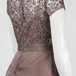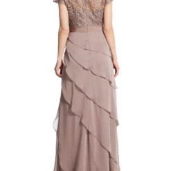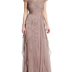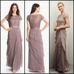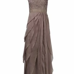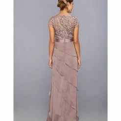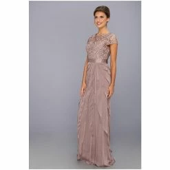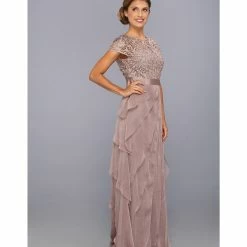 You’ll look classically chic in this elegant Adrianna Papell gown. Full-length gown features an intricately laced bodice, while tiered chiffon decorates the skirt. Satiny ribbon accents the waist to flatter your feminine silhouette. A swirled lace bodice tops an ethereal skirt of tiered chiffon.