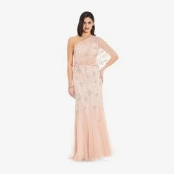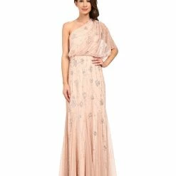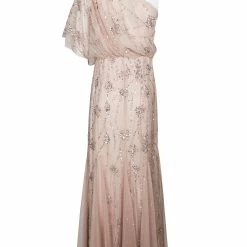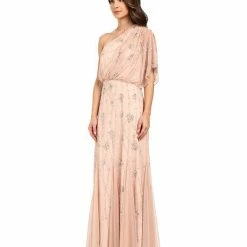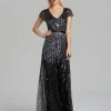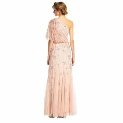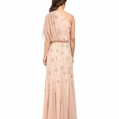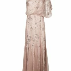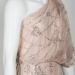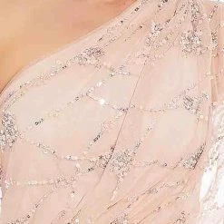 A Grecian style gown is alight with patterns of metallic beads and sequins, finished with wispy godets. Gleaming patterns of metallic sequins and beads light up a Grecian-style gown finished with sheer mesh panels for a slightly flared skirt. Â Elegant evening gown features a popover elastic waist that that lends to an easy drape over the bodice. Â Delicate beading adds the perfect amount of sparkle.