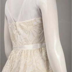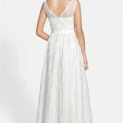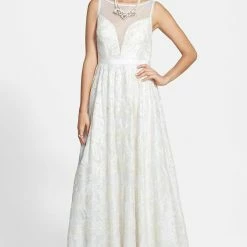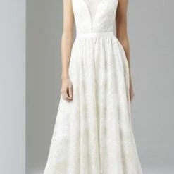 Get swept away on your big day in Adrianna Papell’s stunning gown, featuring an airy illusion neckline with a plunging sweetheart detail. Matte sequins on swirling floral lace add modern romance to this dreamy dress. Matte sequins trace a flourishing pattern across this whimsical lace gown, giving an edgy modern twist to the belle of the ball. Â Mesh veils the plunging illusion neckline for a flirty touch and a banded waist cinches the feminine silhouette.