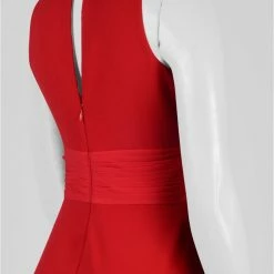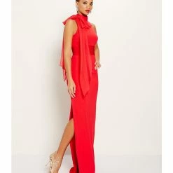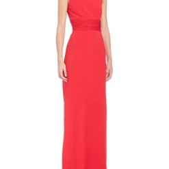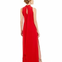 A high neck sweeps to the back with a dramatic silk chiffon tie on this sleek sleeveless evening gown that flatters with gathered silk through the waist and soaring side slits. Â Neck tie can be tied in the front, back, or left loose – as shown in the different photos.