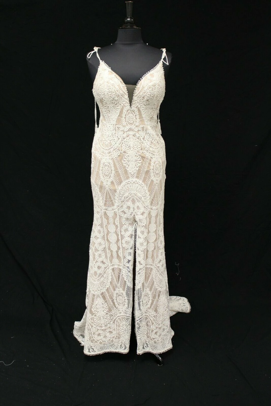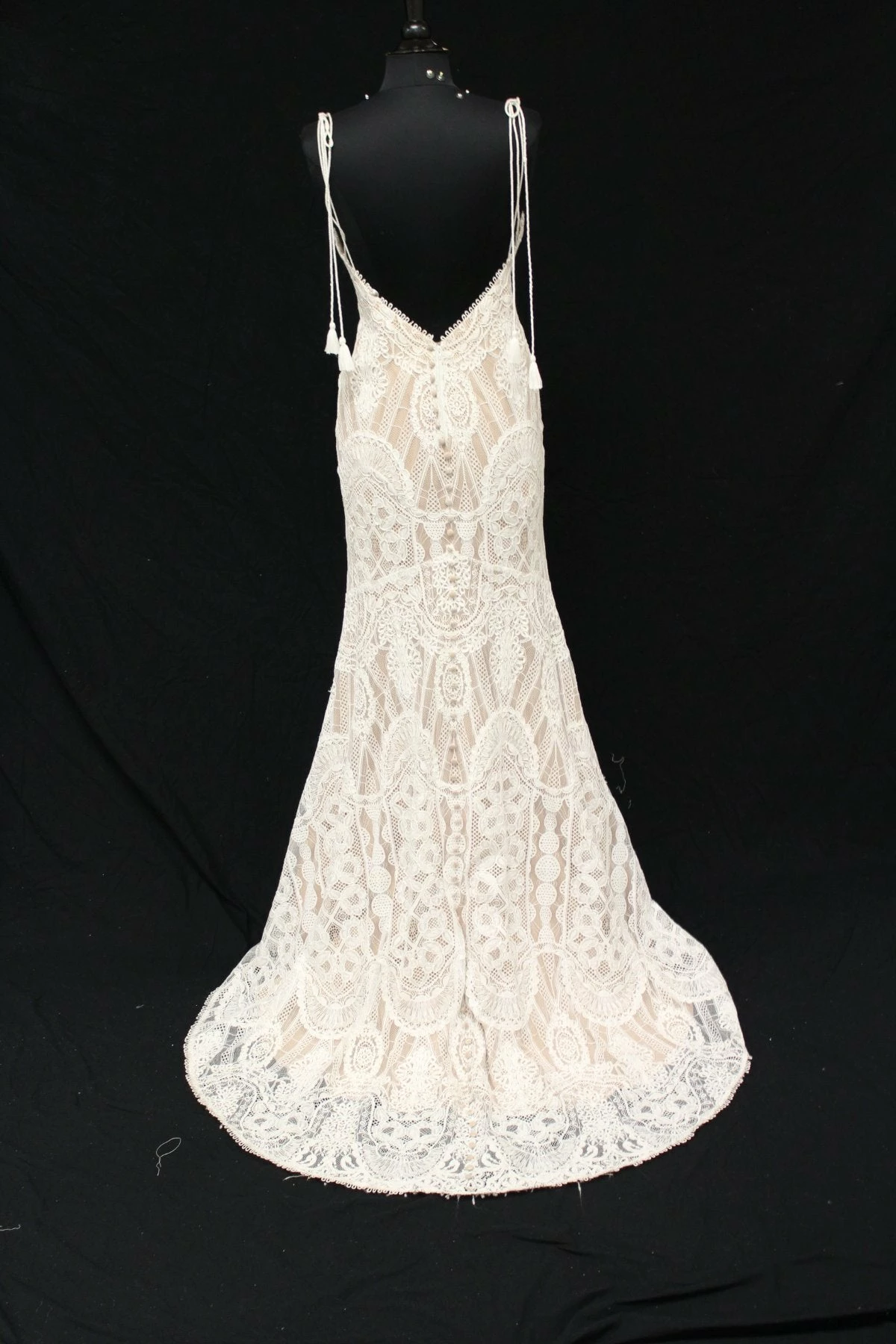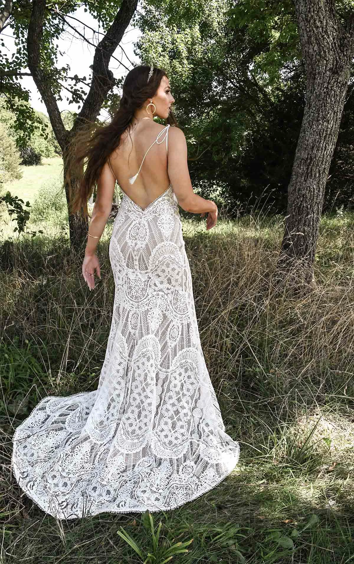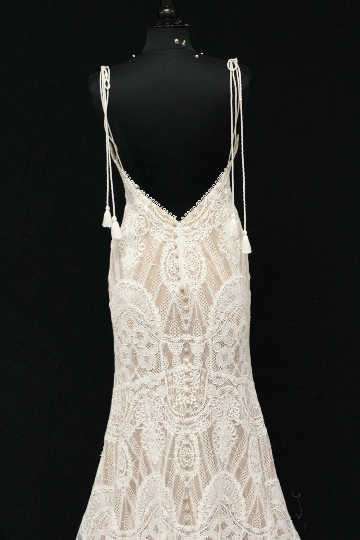 DESCRIPTION: This is a current All Who Wander style. Vintage fringe and Woodstock vibes come together in detailed harmony with All Who Wander’s Arlo wedding dress. The graphic laces of this design are bigger, bolder and better than ever before–complete with heirloom-style patterns and eyelet trims, creating a striking contrast. The braided straps with tassels tie together with bows along the shoulders for an extra dose of charming detail, which fall perfectly about the breathtaking open back. The slit in the front of the skirt makes for ease of movement and a sultry statement within this sheath silhouette, while an easygoing train completes the look with a fresh, lightweight feel.