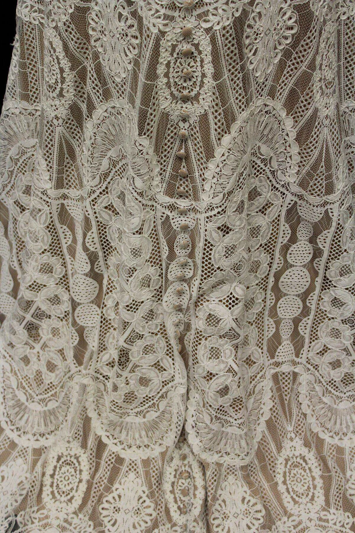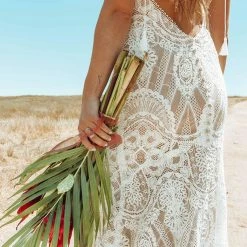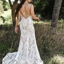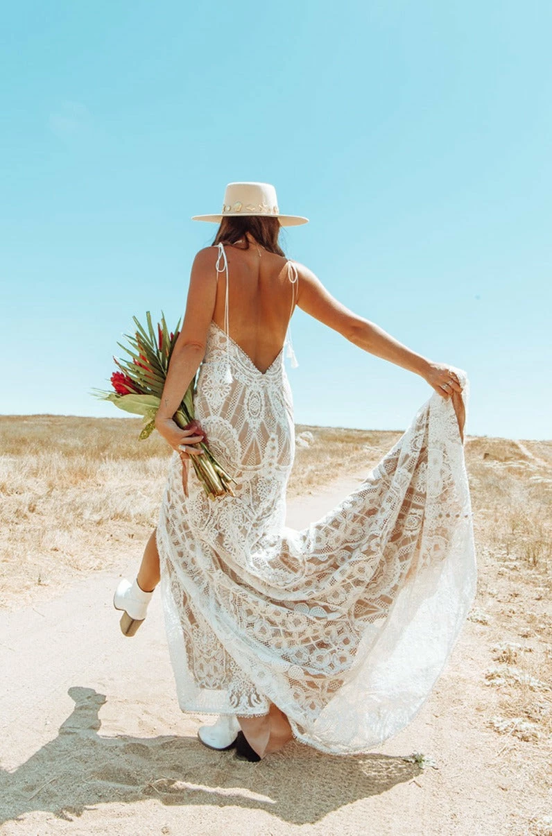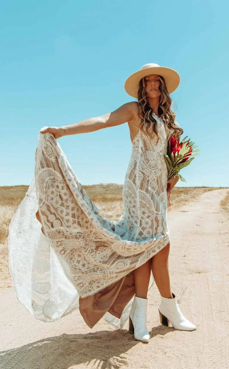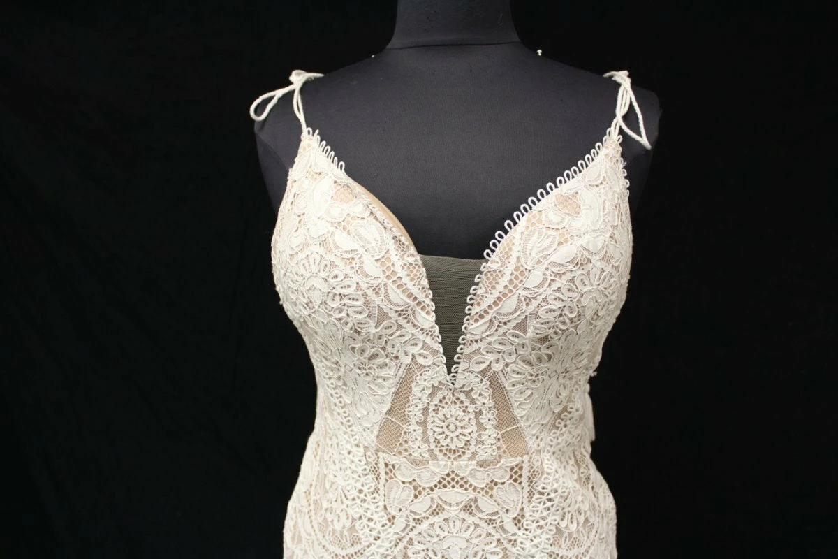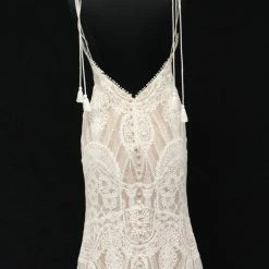 DESCRIPTION: This is a current All Who Wander style. Vintage fringe and Woodstock vibes come together in detailed harmony with All Who Wander’s Arlo wedding dress. The graphic laces of this design are bigger, bolder and better than ever before–complete with heirloom-style patterns and eyelet trims, creating a striking contrast. The braided straps with tassels tie together with bows along the shoulders for an extra dose of charming detail, which fall perfectly about the breathtaking open back. The slit in the front of the skirt makes for ease of movement and a sultry statement within this sheath silhouette, while an easygoing train completes the look with a fresh, lightweight feel.