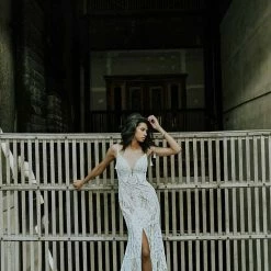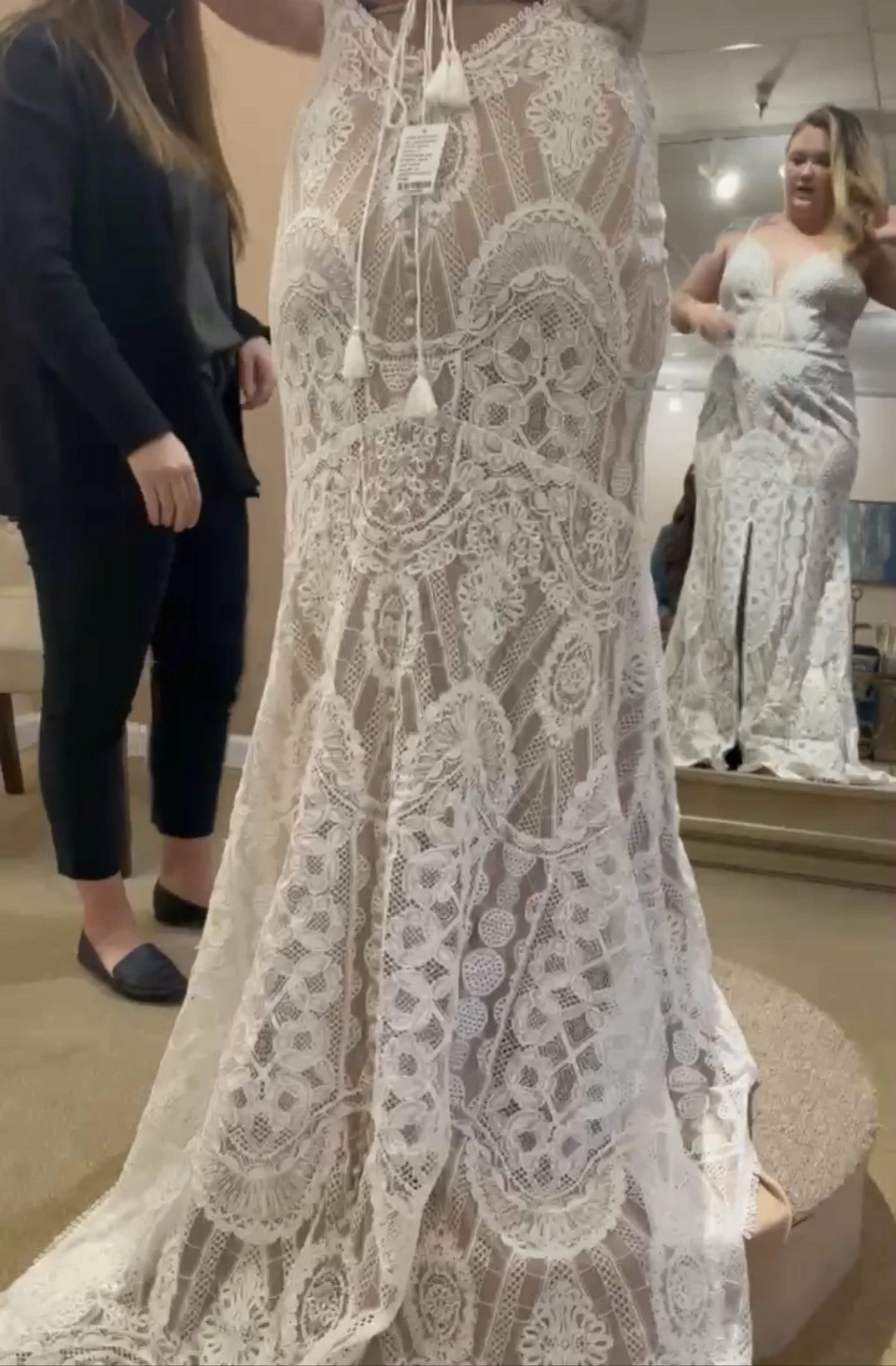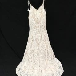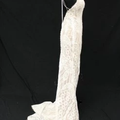 This gown is by bridal designer All Who Wander. The style is called Arlo. It is designed in Lace. The color is Ivory/Hazelnut/Porcelain in a size 10. The original retail price of this gown was $2,500.00