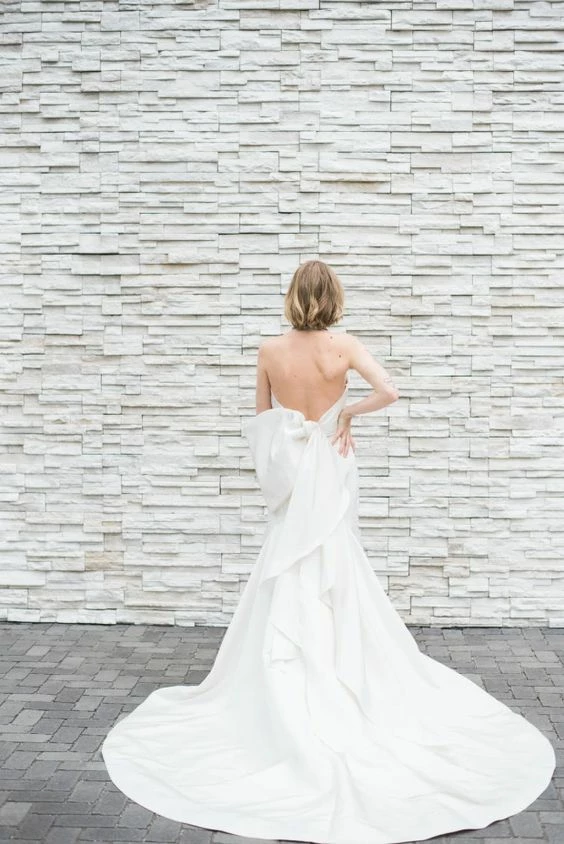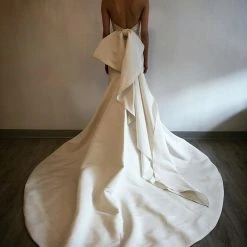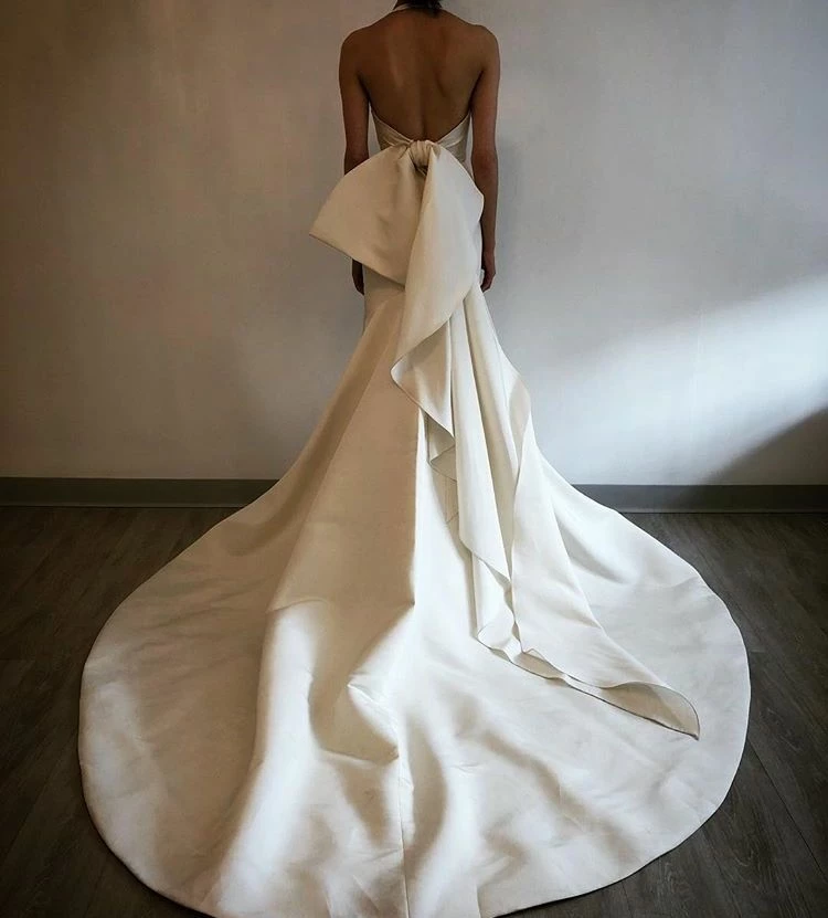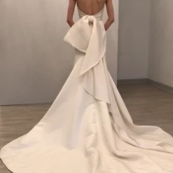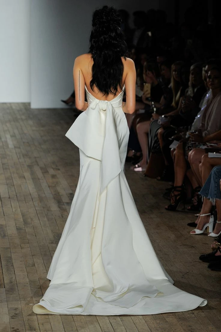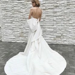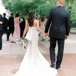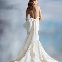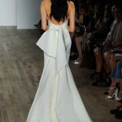 Sample gown that has been tried on in store. Minor dust along the hemline. The snaps that attach to the detachable bow need to be reattached (super easy fix for any seamstress). Never worn outside the salon and never altered. Retail price: $3,300.Â
