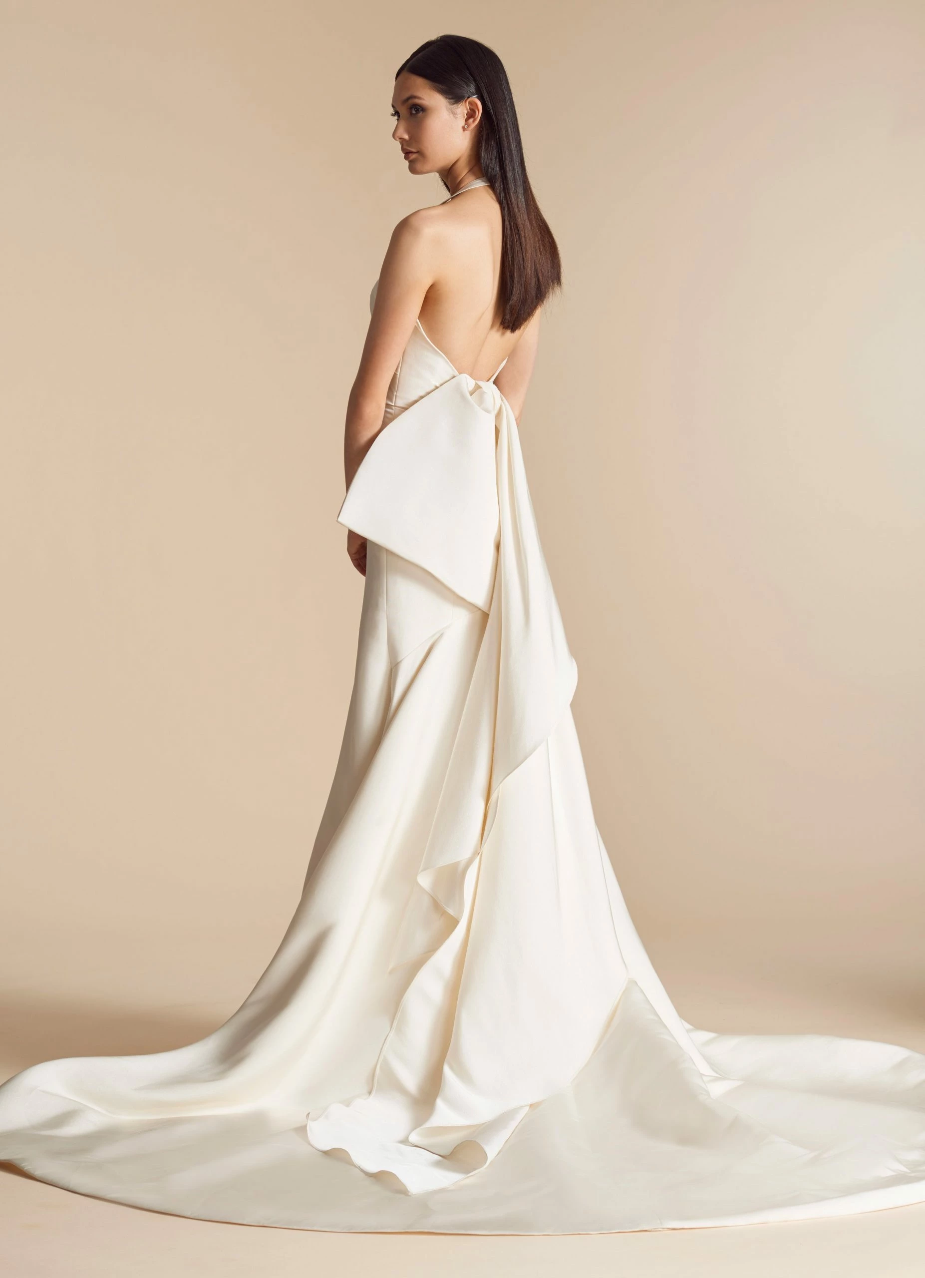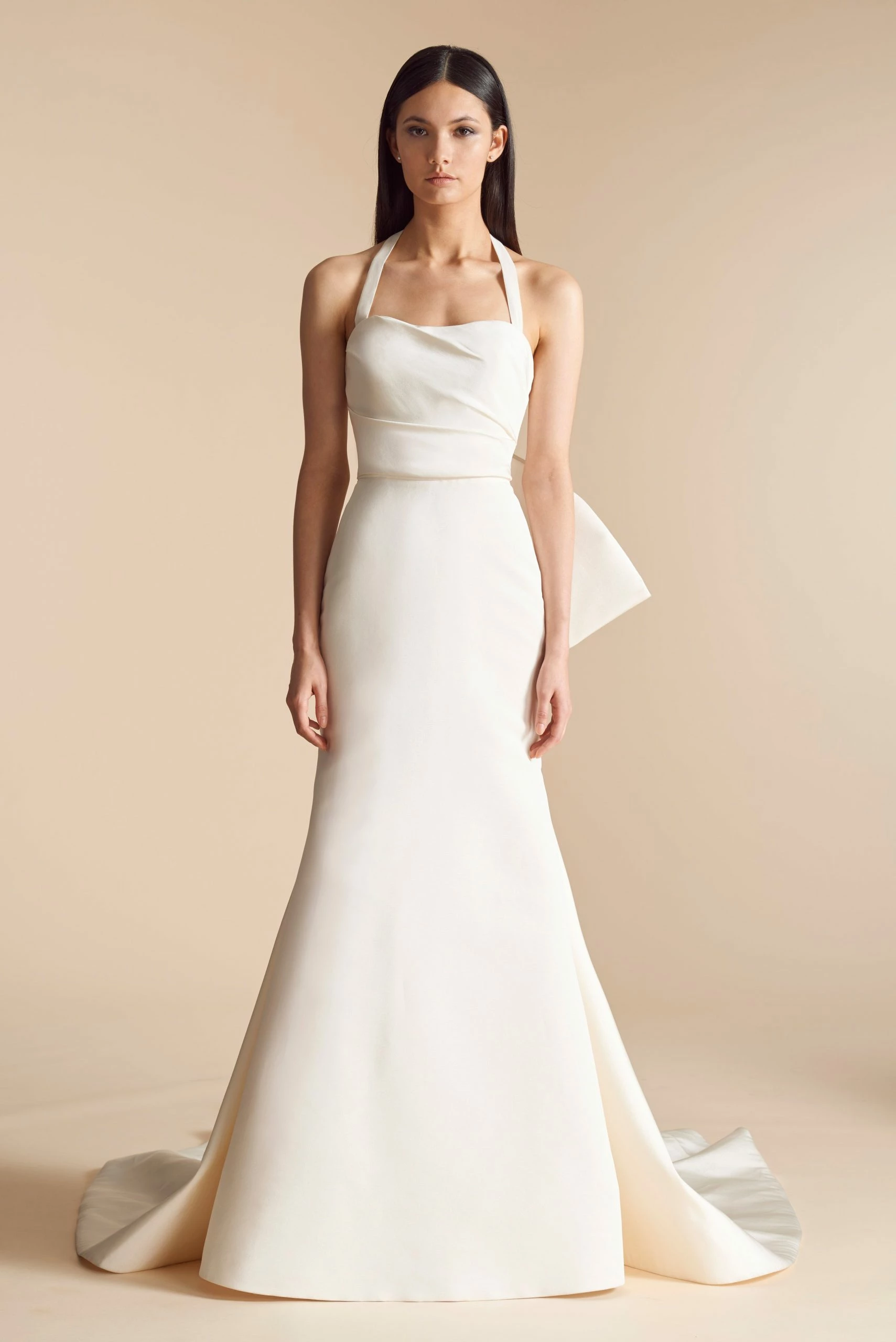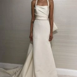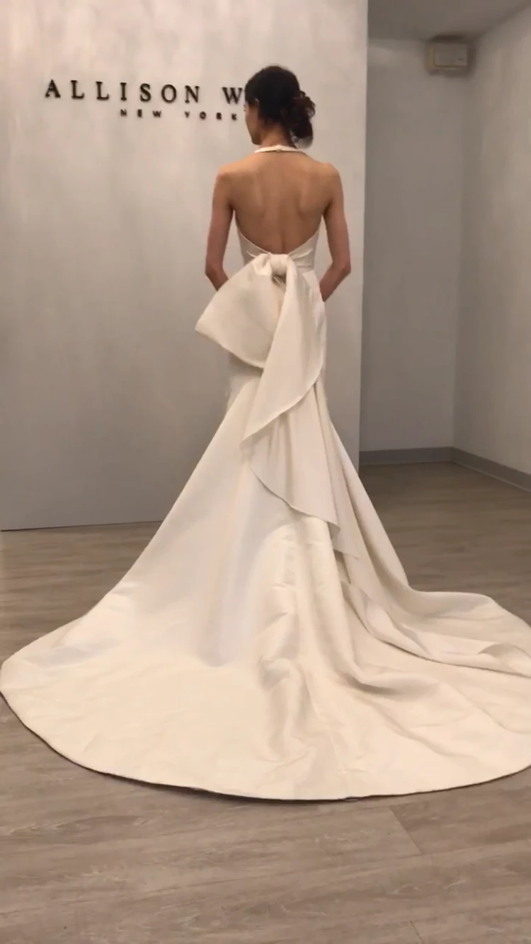 Allison Webb Kingsland bridal gown –Â Ivory silk faille fit to flare bridal gown with draped bodice, molded neckline with halter straps. Detachable origami half bow, chapel train.