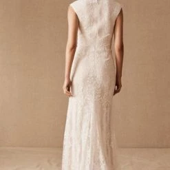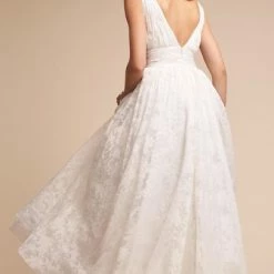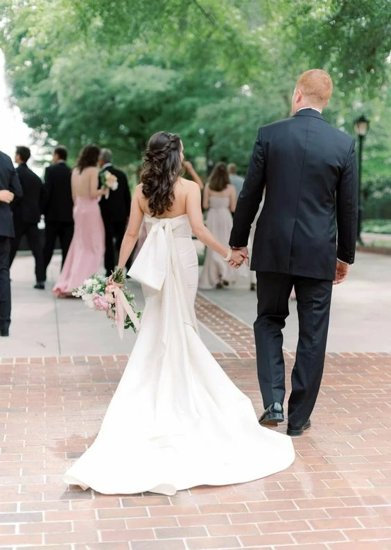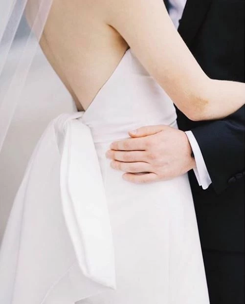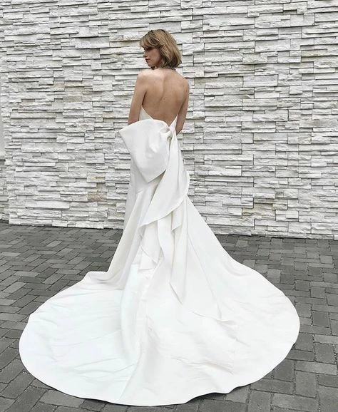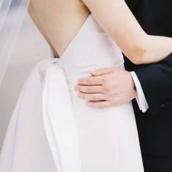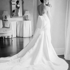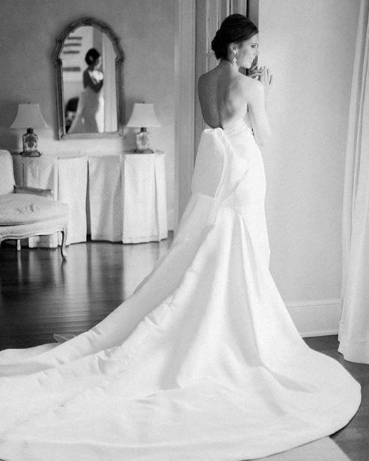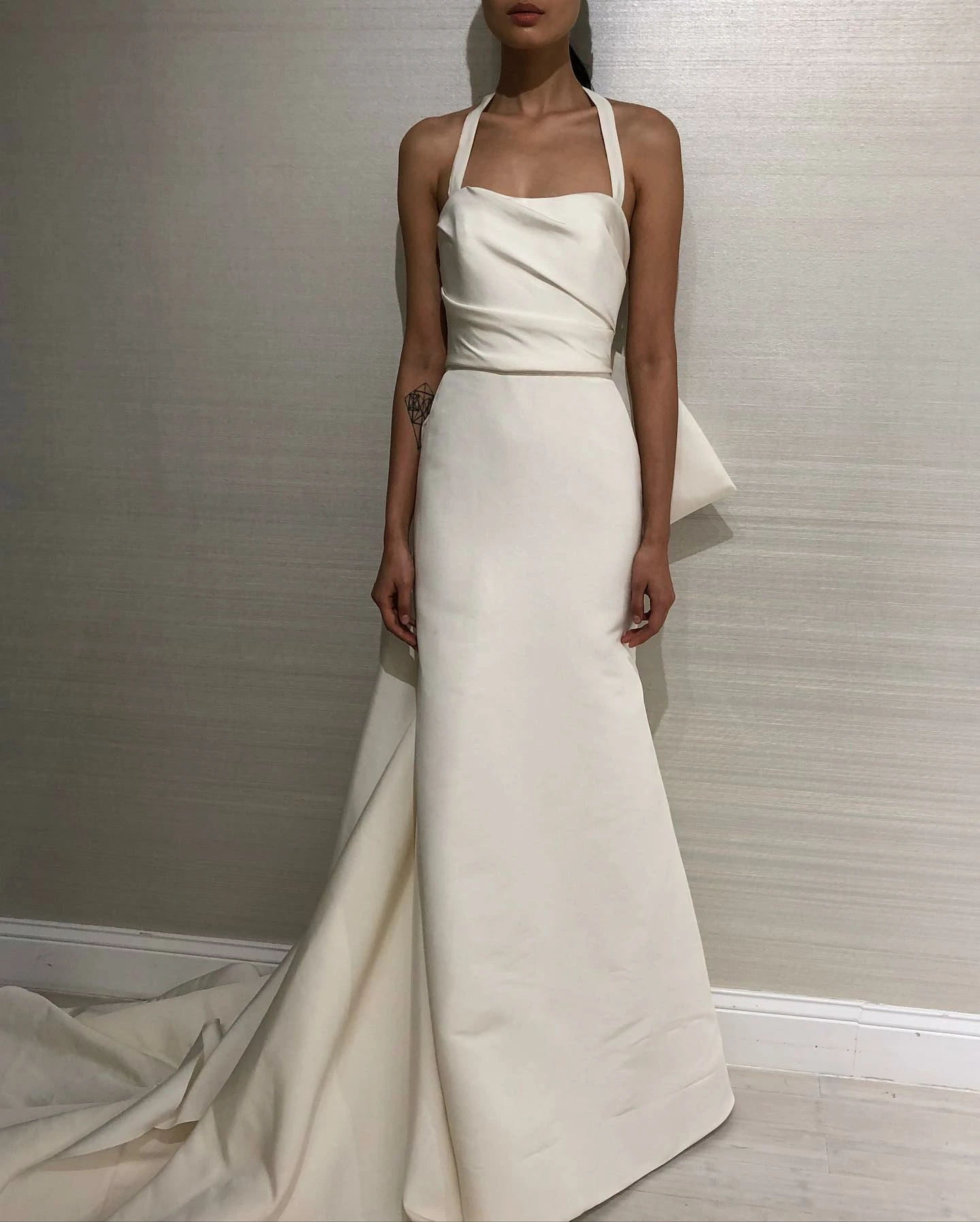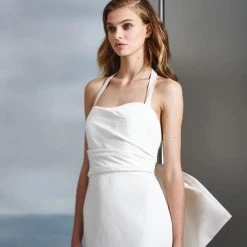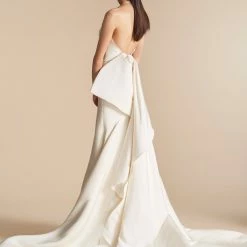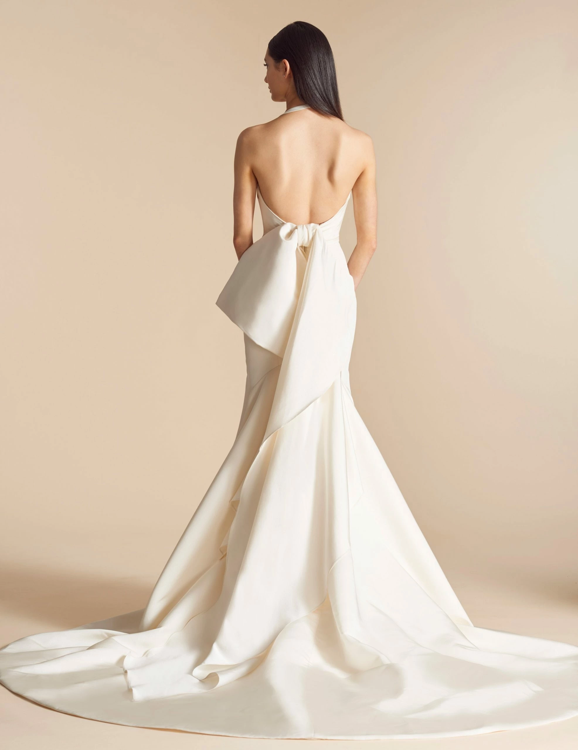 Allison Webb Kingsland bridal gown –Â Ivory silk faille fit to flare bridal gown with draped bodice, molded neckline with halter straps. Detachable origami half bow, chapel train.