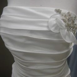 This gown is simple elegance and is from Allure’s Exclusive Bridal collection. The gown has detailed beading applique on the left neckline as well as a beaded applique on the right hip of the dress where fabric is gathered. The dress is a zip up and has satin covered buttons along the zipper. The fit and flare skirt has pick ups and a bubble hem. The fabric on this gown is diamond white satin. This gown is discontinued and is longer available to reorder.