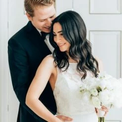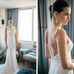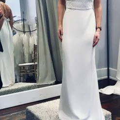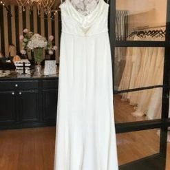 Condition: This gown was a sample at a high end bridal salon. Never worn outside the salon and never altered. In like-new condition. Very minor dust along the hemline (in the inside) and very minor fraying of the lace on the shoulder area. No noticeable when worn. This gown is in ready to wear condition! Retail price: $2,400!