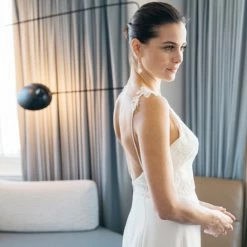 The cosmopolitan French Pop Art lace makes this gown sing with a sensual and sophisticated high front neckline complemented by a low, open backline. Add signature 4-ply silk crepe skirt to turn up the drama and intrigue of Harlem’s languid, sexy sheath silhouette. Made with soul in San Francisco.