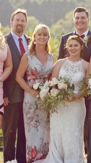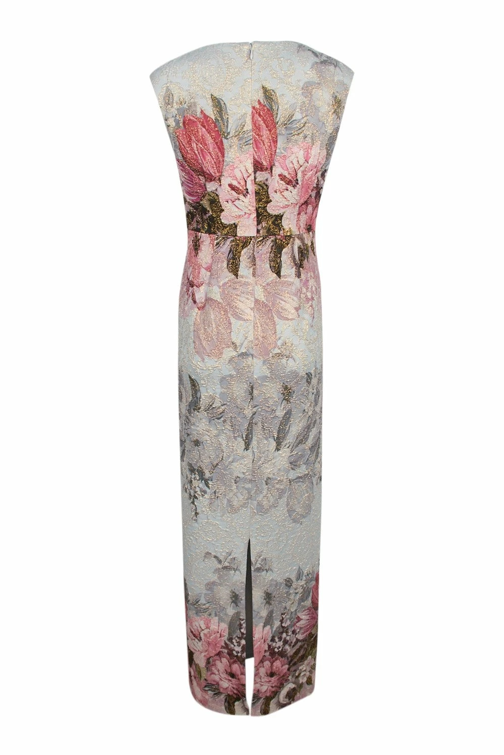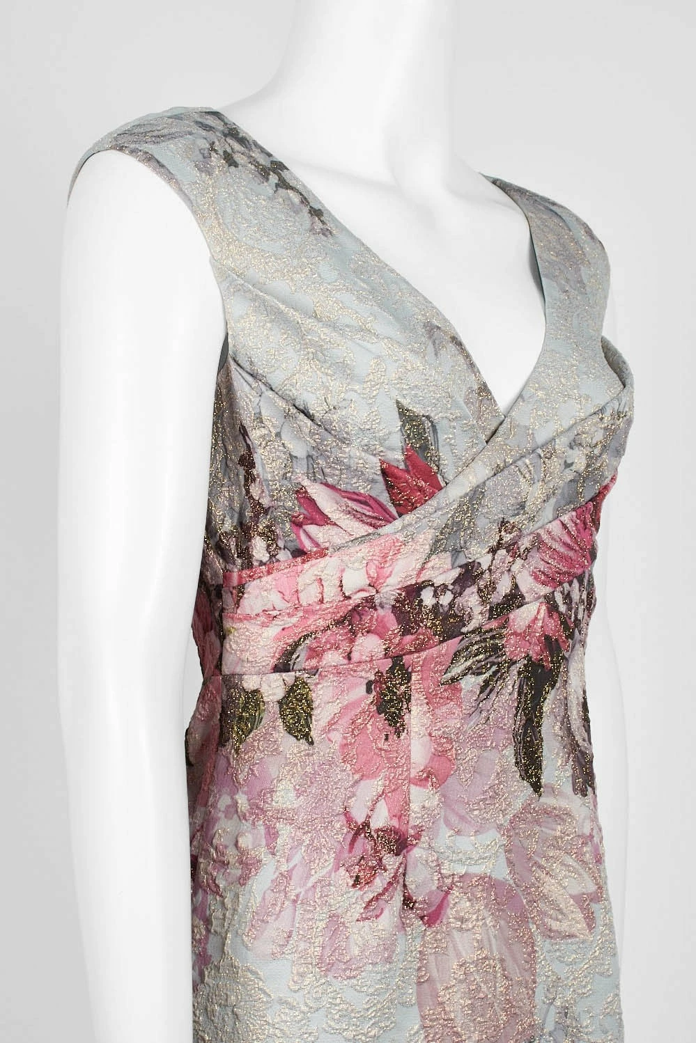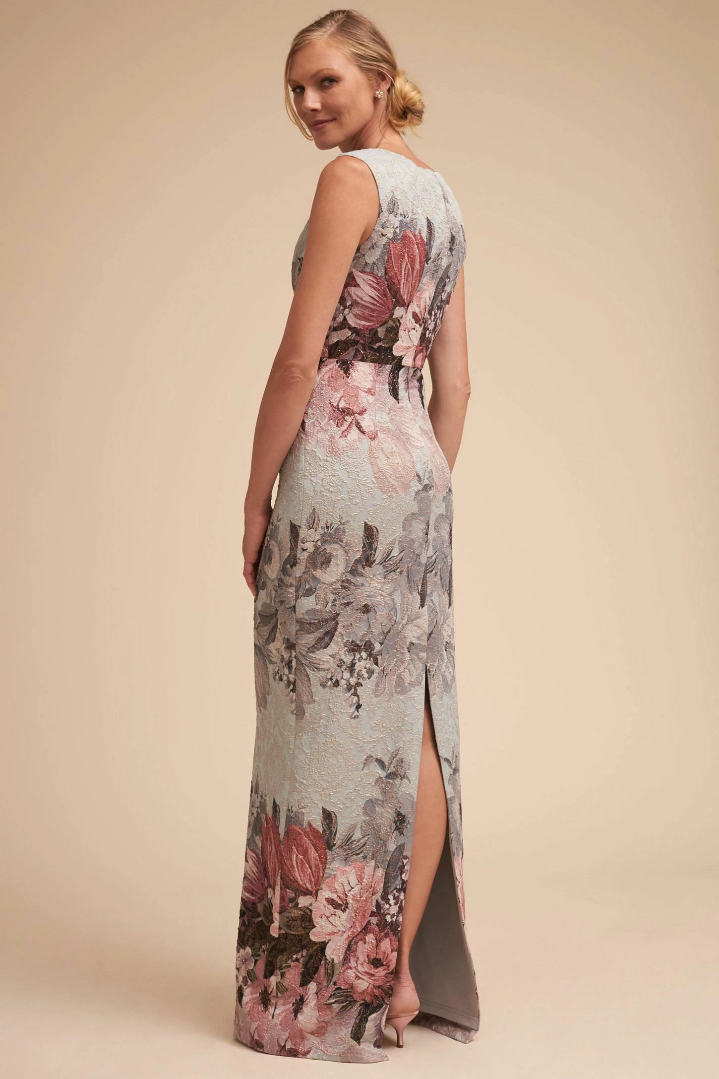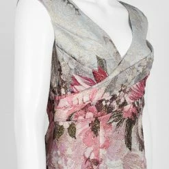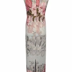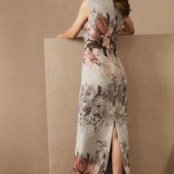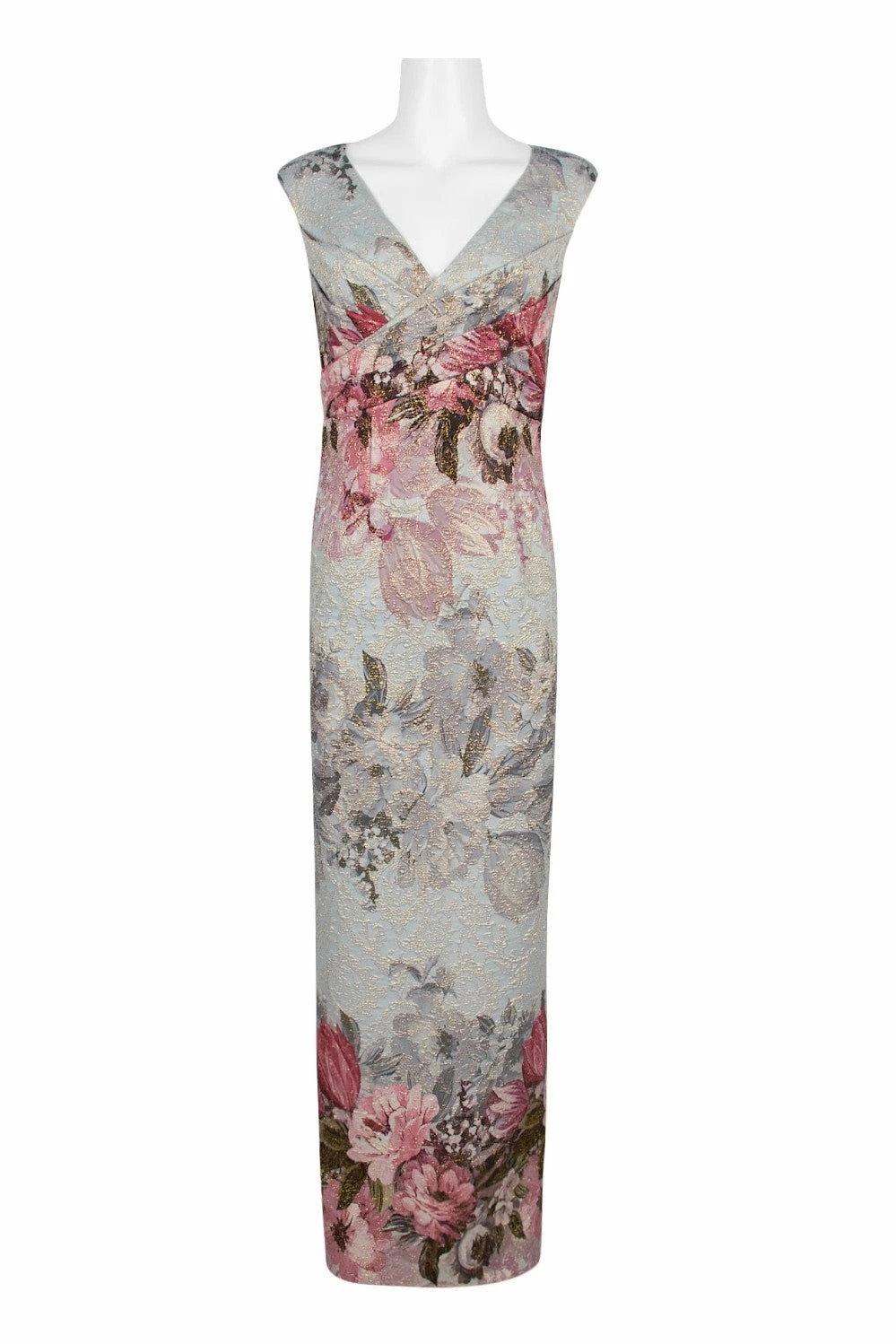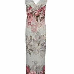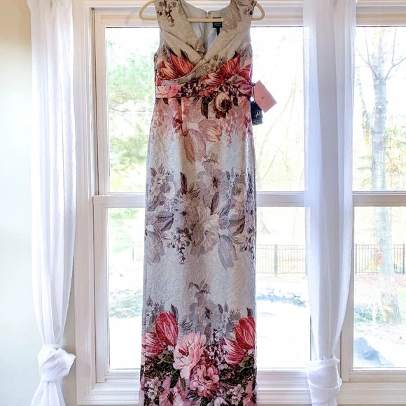 Oversized florals in soft hues adorn textured crepe with a soft metallic sheen. This maxi’s close fit and stretchy construction flatters your figure and enhances curves, while the surplice bodice defines the waist. A v-neck and back slit round out the look. By Adrianna Papell. Â