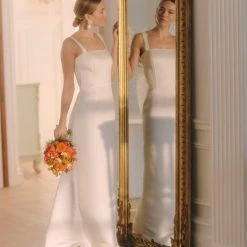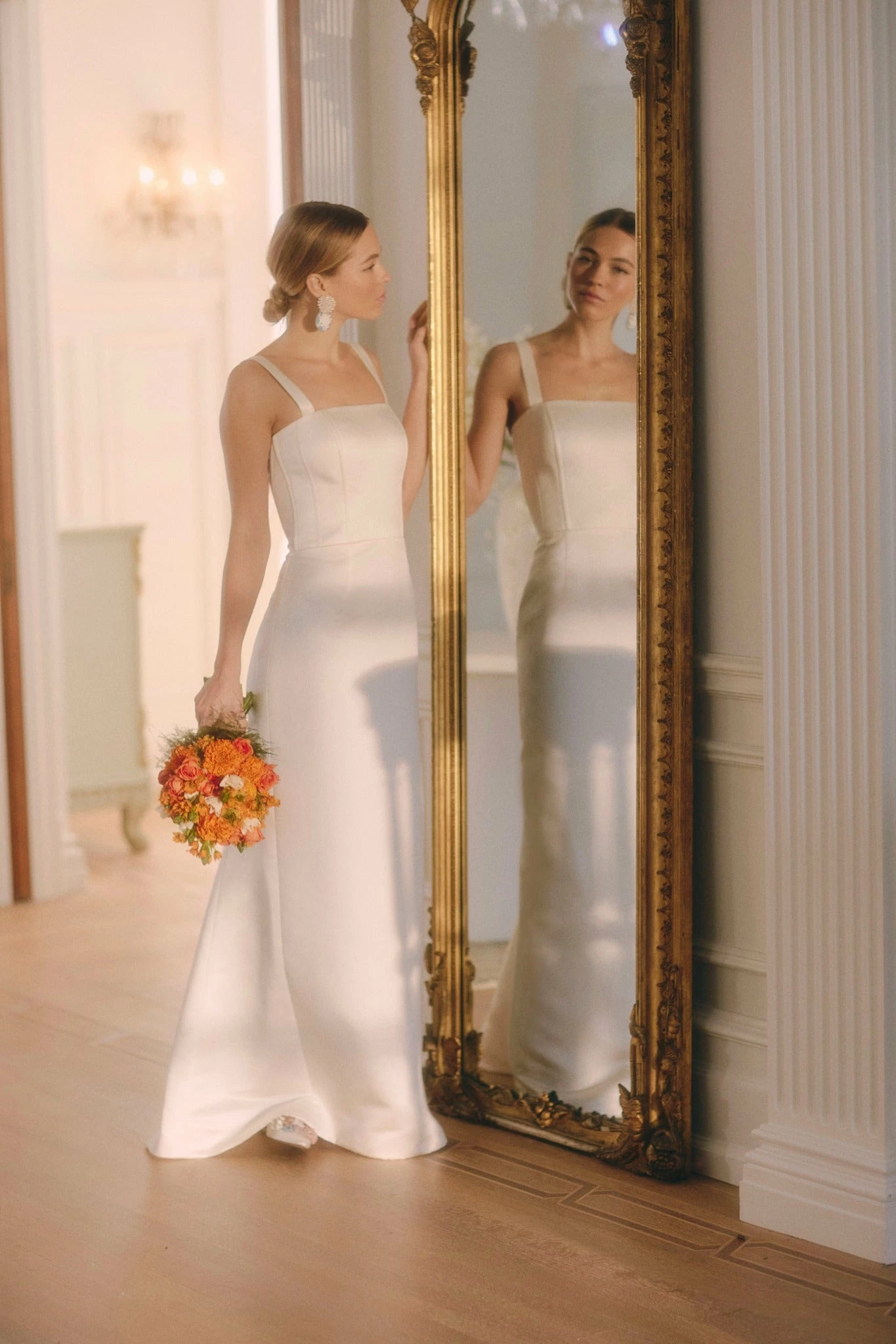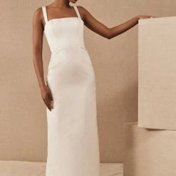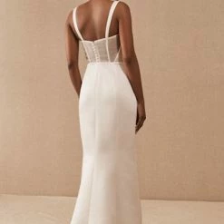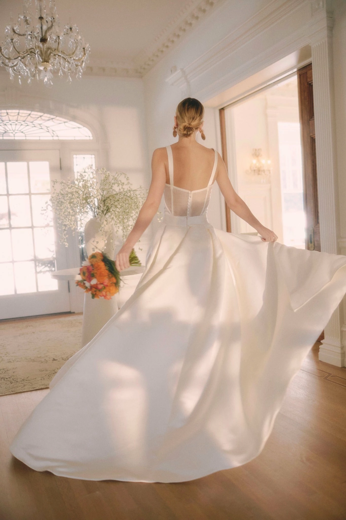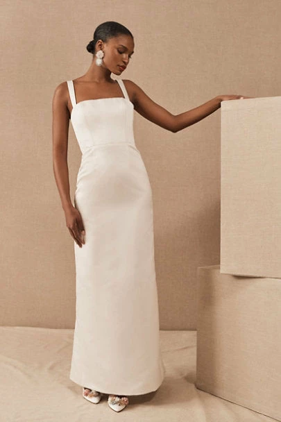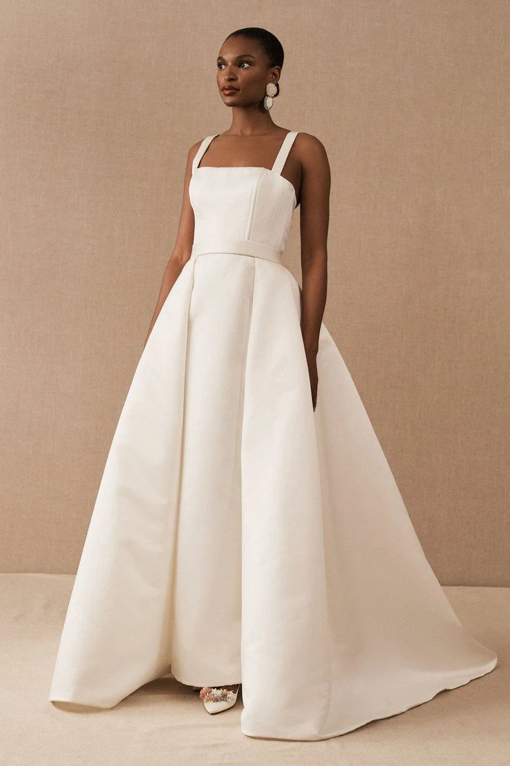 Luxurious duchesse satin construction gives this modern gown a structural silhouette, finished with a chic square neckline and sheer corset back. Wear the tailored column on its own for understated elegance, or pair with the detachable overskirt for a dramatic flourish. By BHLDN x Amsale.