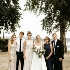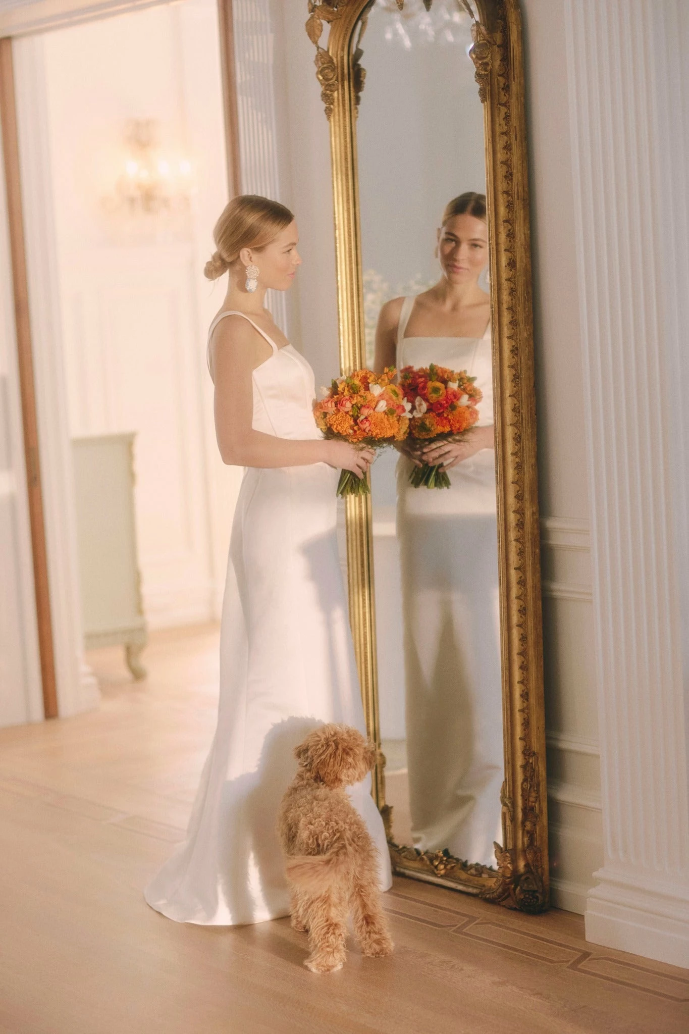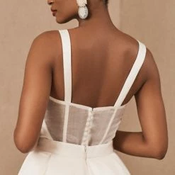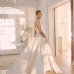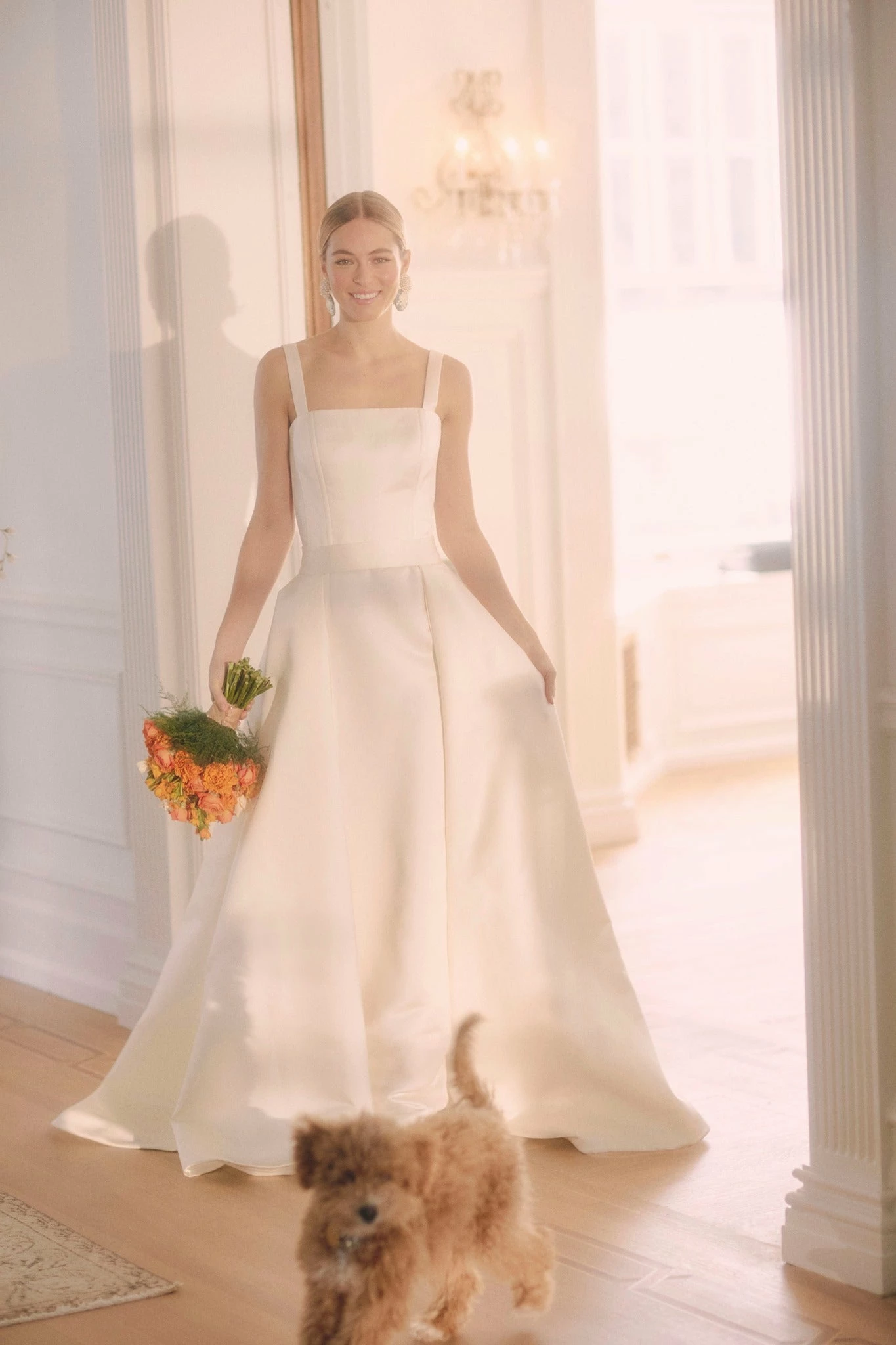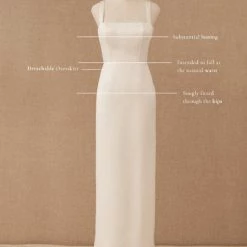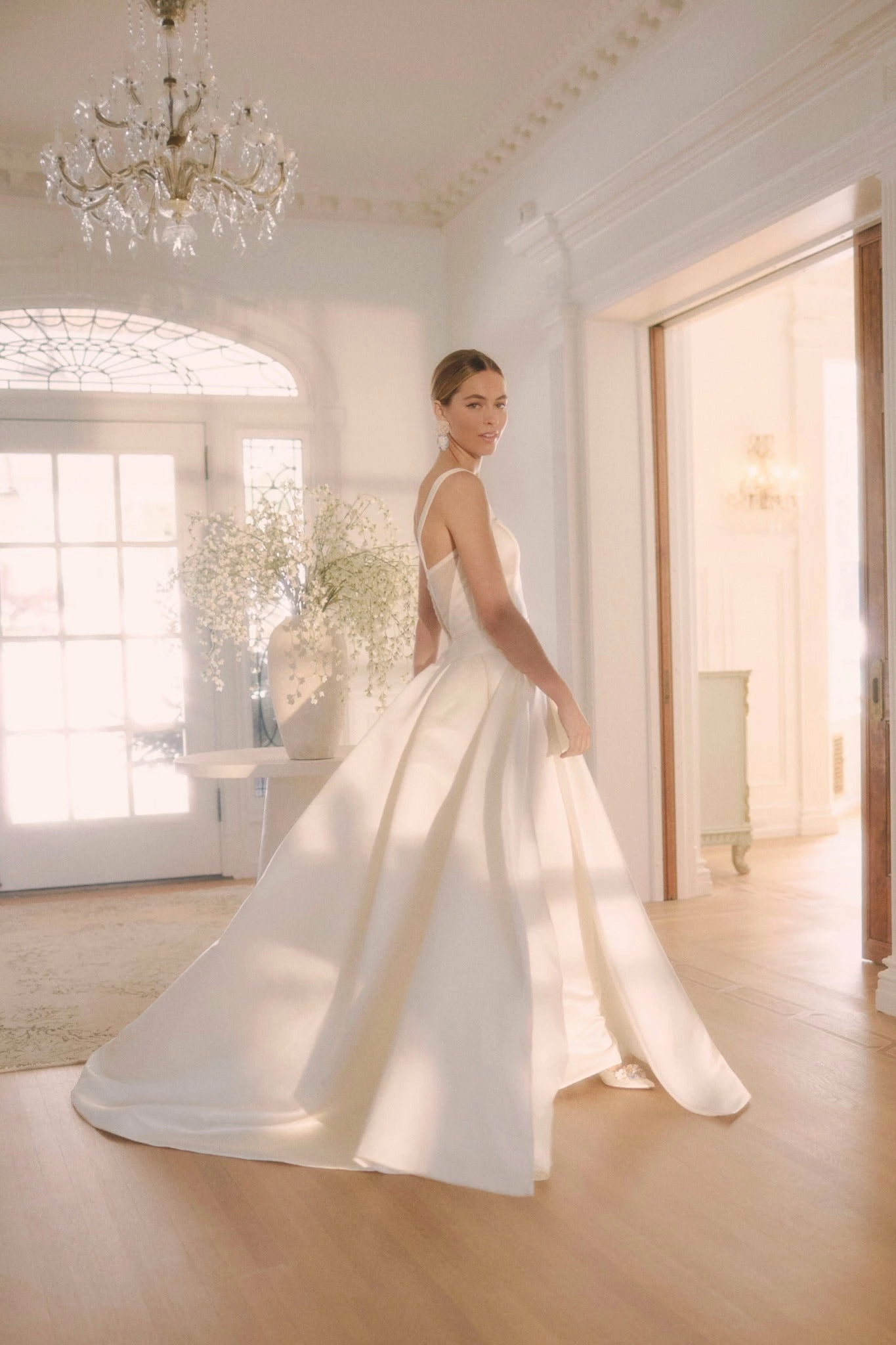 Luxurious duchesse satin construction gives this modern gown a structural silhouette, finished with a chic square neckline and sheer corset back. Wear the tailored column on its own for understated elegance, or pair with the detachable overskirt for a dramatic flourish. By BHLDN x Amsale.