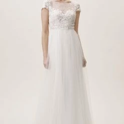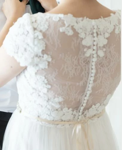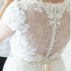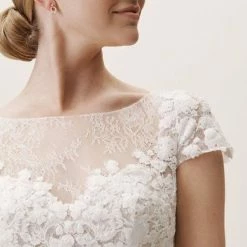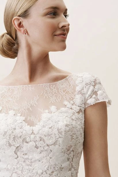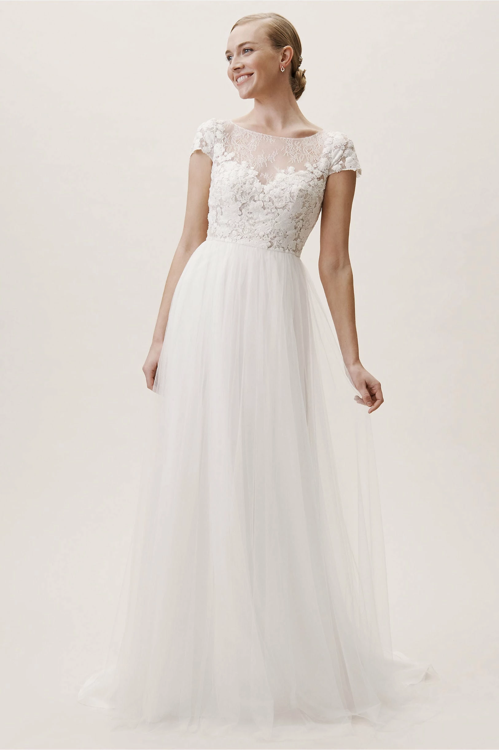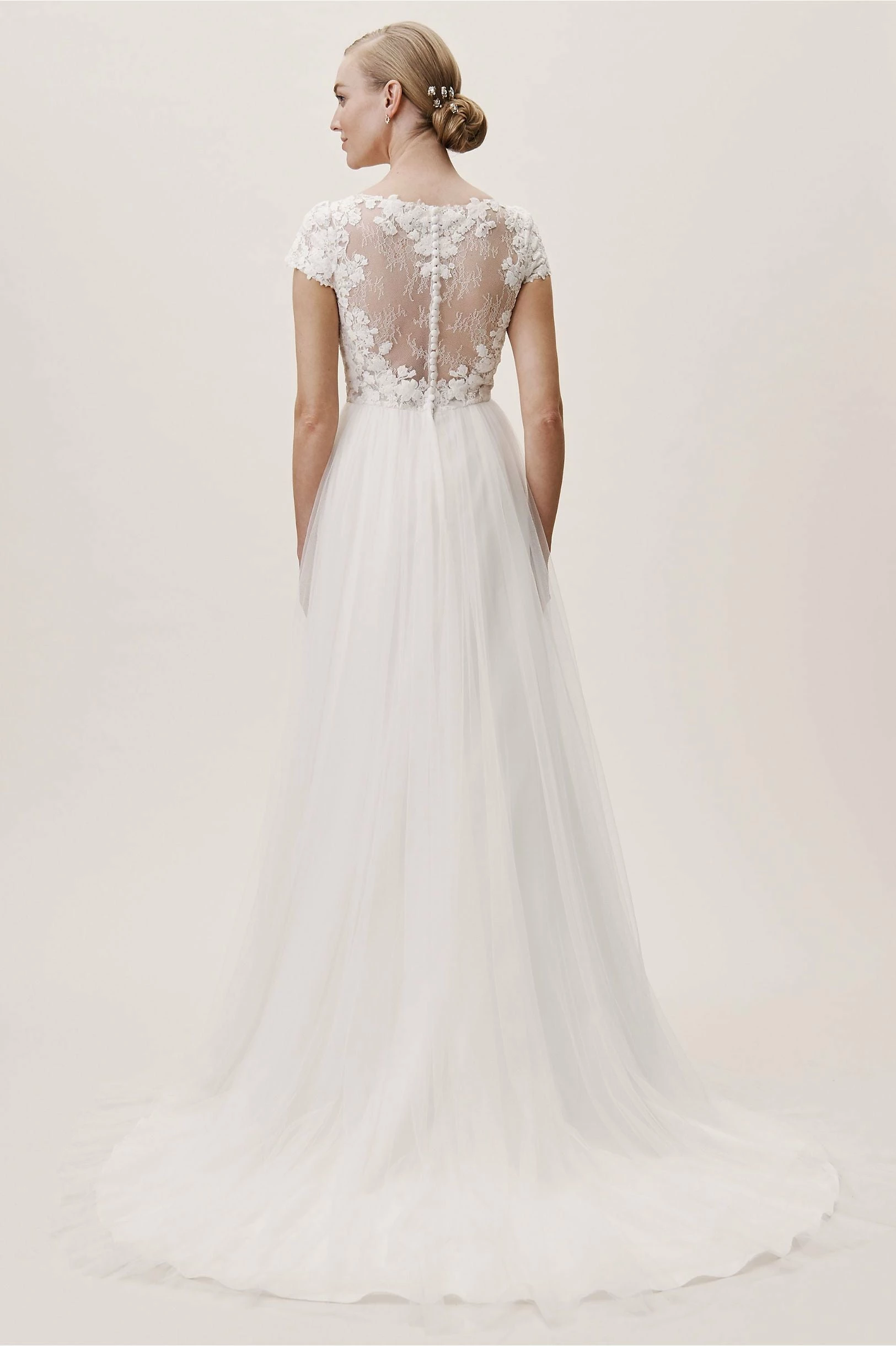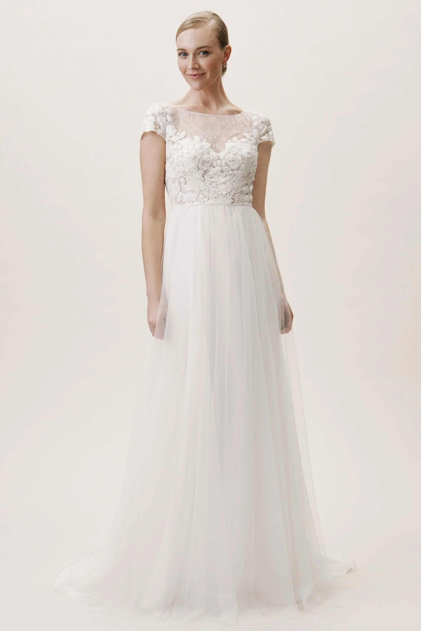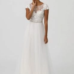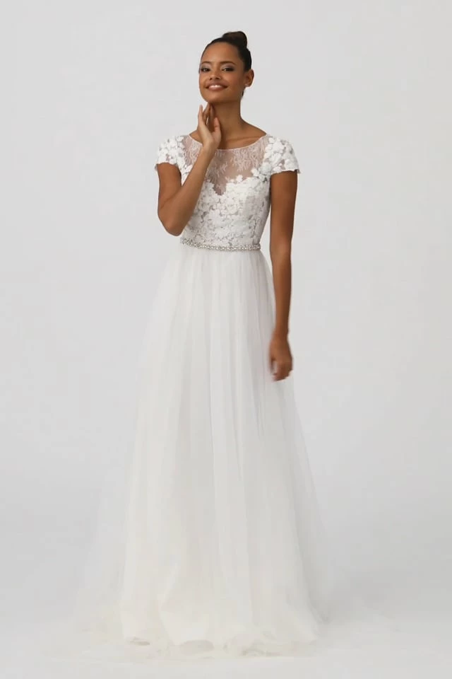 Designed for airy movement, an ethereal tulle skirt finishes this romantic gown. The chantilly lace bodice is accented by embroidered floral applique and short sleeves.