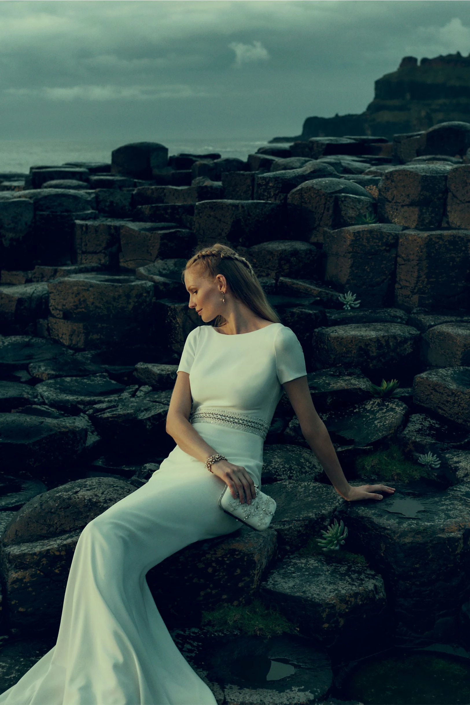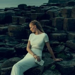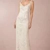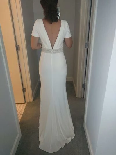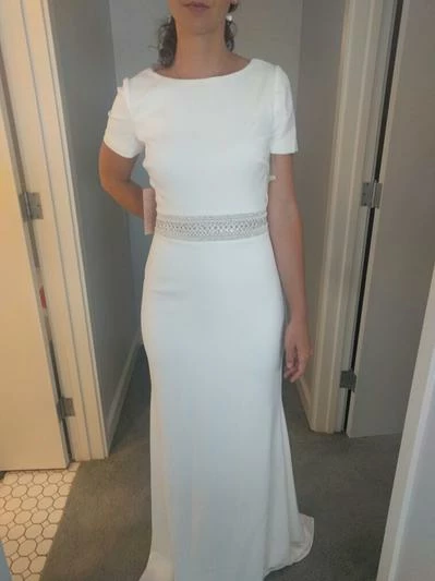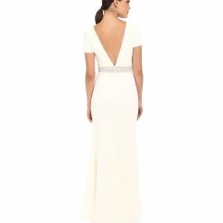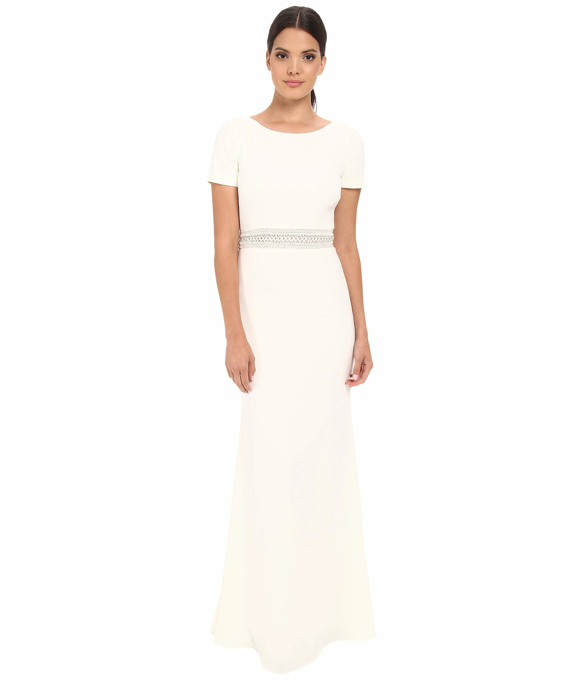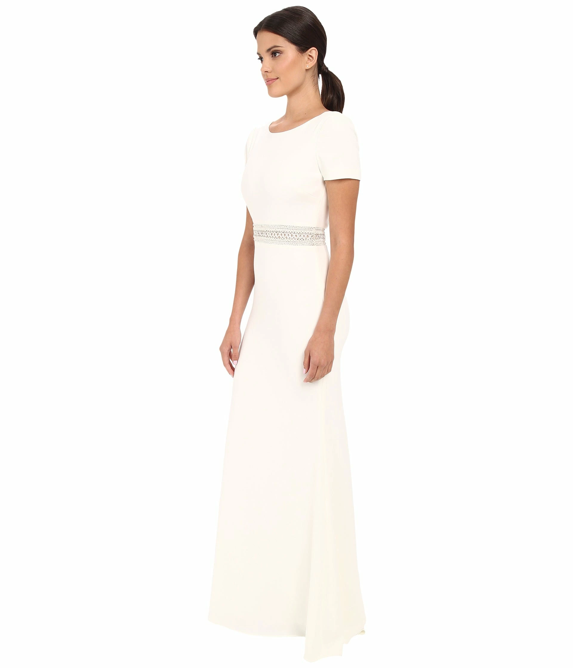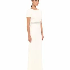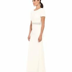 For the feminine sophisticate, this stretch crepe gown features clean contours with a wink of beaded, semi-sheer embroidery that highlights the natural waist. You’ll look opulent in white in this femininely chic Badgley Mischka Gown. Sheath silhouette. Round neckline and V-shaped back. Short sleeves. Gorgeous trim detail at center of bodice.Â