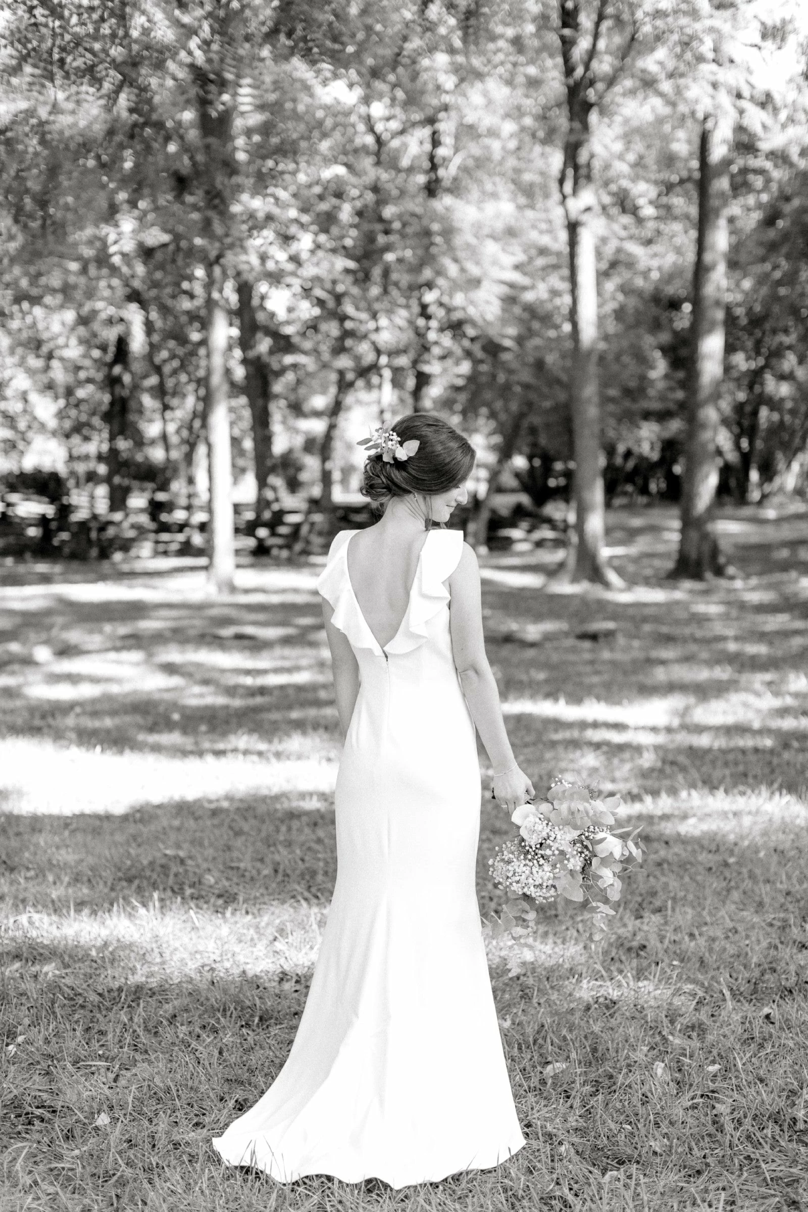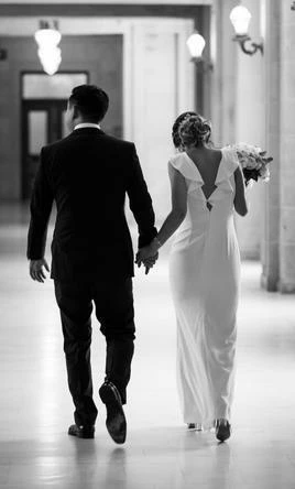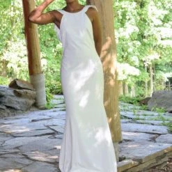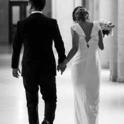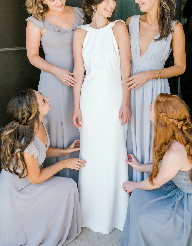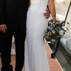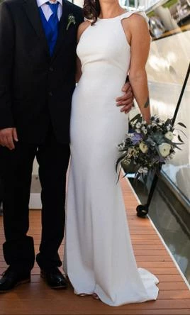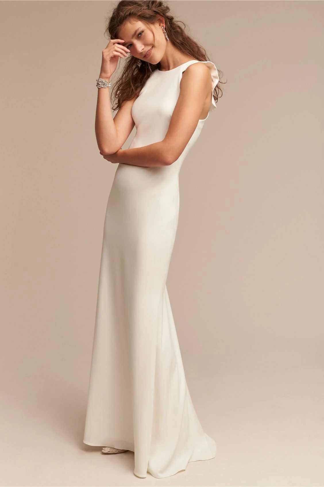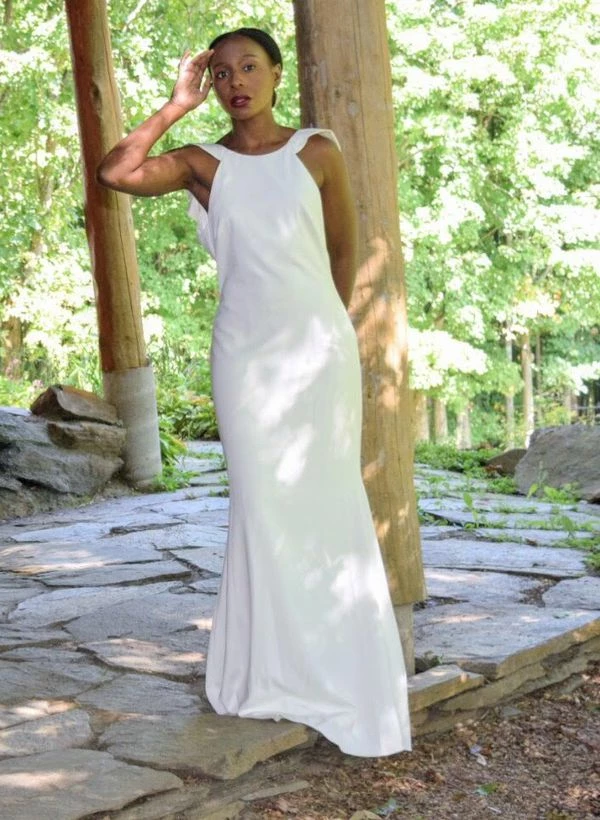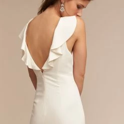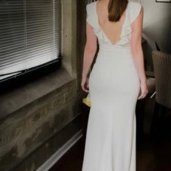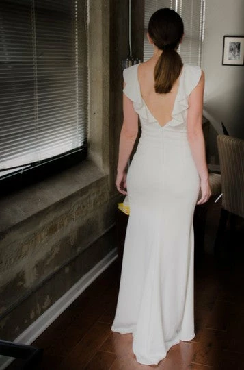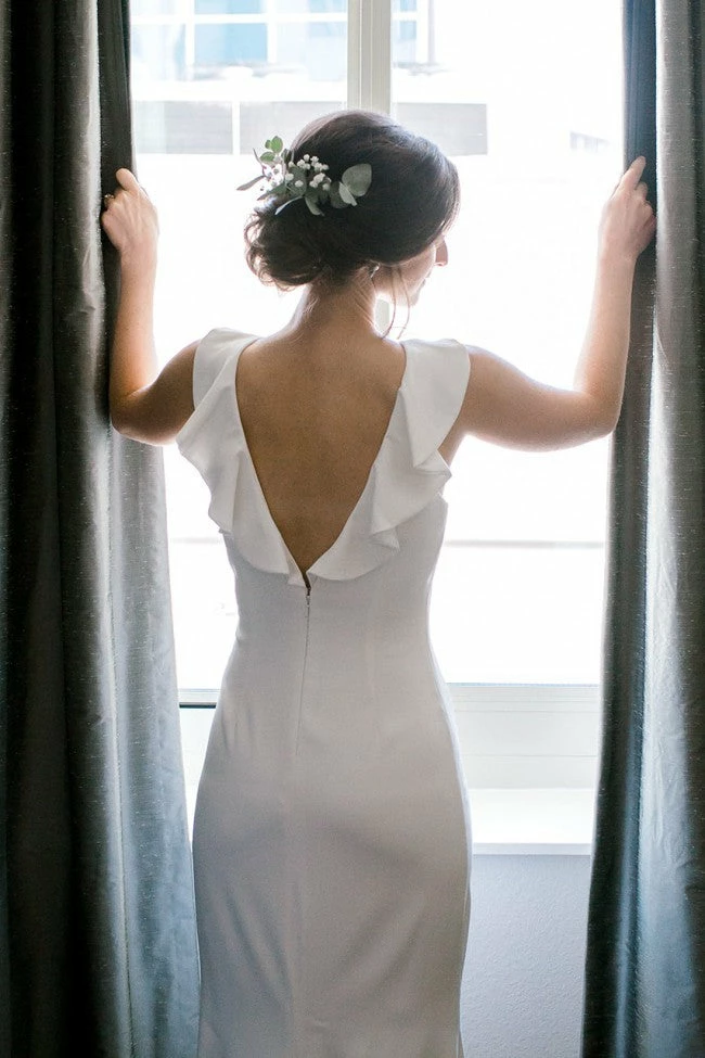 For the modern bride who favors clean lines and striking details, this chic ivory crepe gown features a slim, sleeveless silhouette and ruffled v-back.