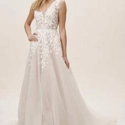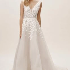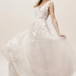 Textural appliques adorn the bodice and float down through the full skirt, crafted from layers of glitter tulle. A plunge neckline adds a sultry edge to the whimsical look, and a removable grosgrain belt defines the waist. By BHLDN.