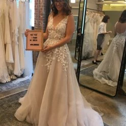 Size 2. Sample gown that has been tried on in store. Overall in excellent condition! Minor wear on the applique from being handled and one button loop on the back needs to be repaired. Current style. Retail price: $1,400!