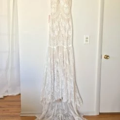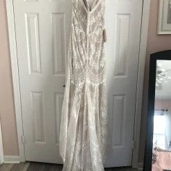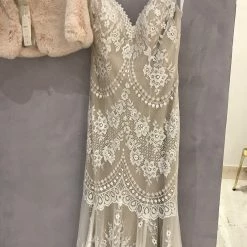 Size 12. This gown has been tried on in store, but it’s in excellent condition. Retail price: $1,200.