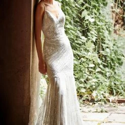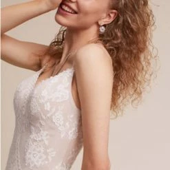 The relaxed mermaid silhouette of the Cascading Lace Gown is absolutely breathtaking. Beautiful and delicate wedding gown with relaxed mermaid silhouette, illusion back, barely-there straps, and an exaggerated sweetheart neckline.
