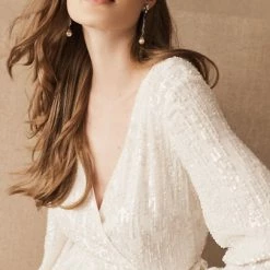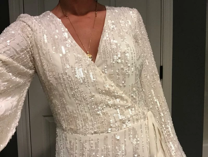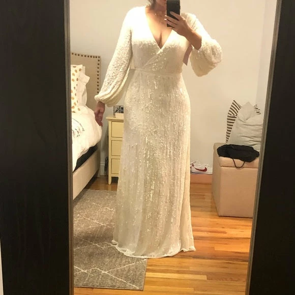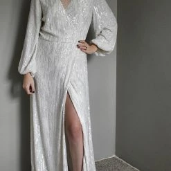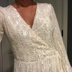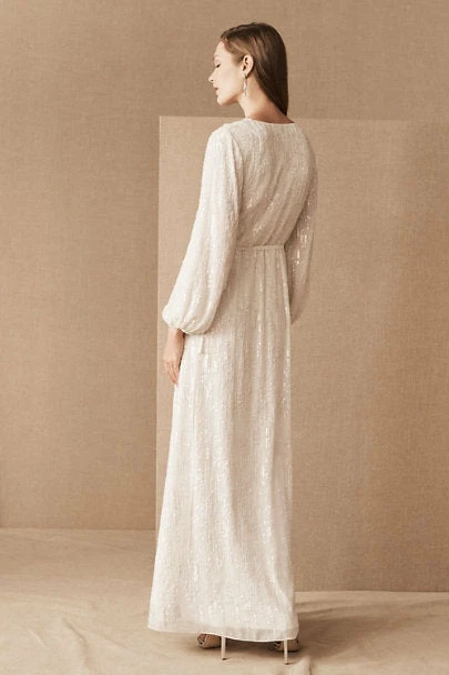 Allover sparkle elevates the effortless wrap silhouette of this flowing maxi dress. By BHLDN. Tie closure – wrap dress Perfect look for a wedding dress, micro-wedding, second dress look and everything in between!