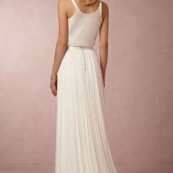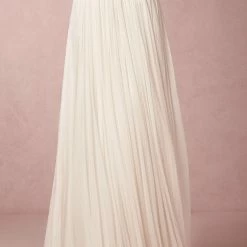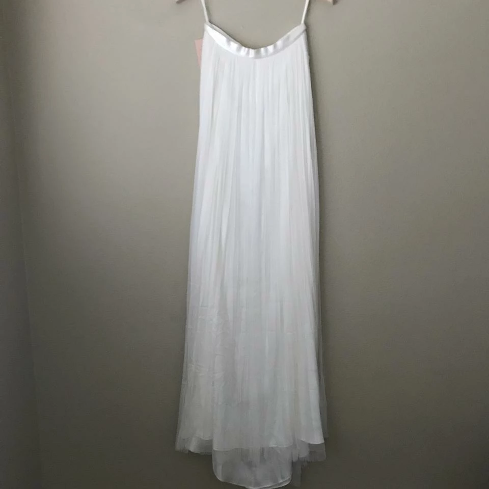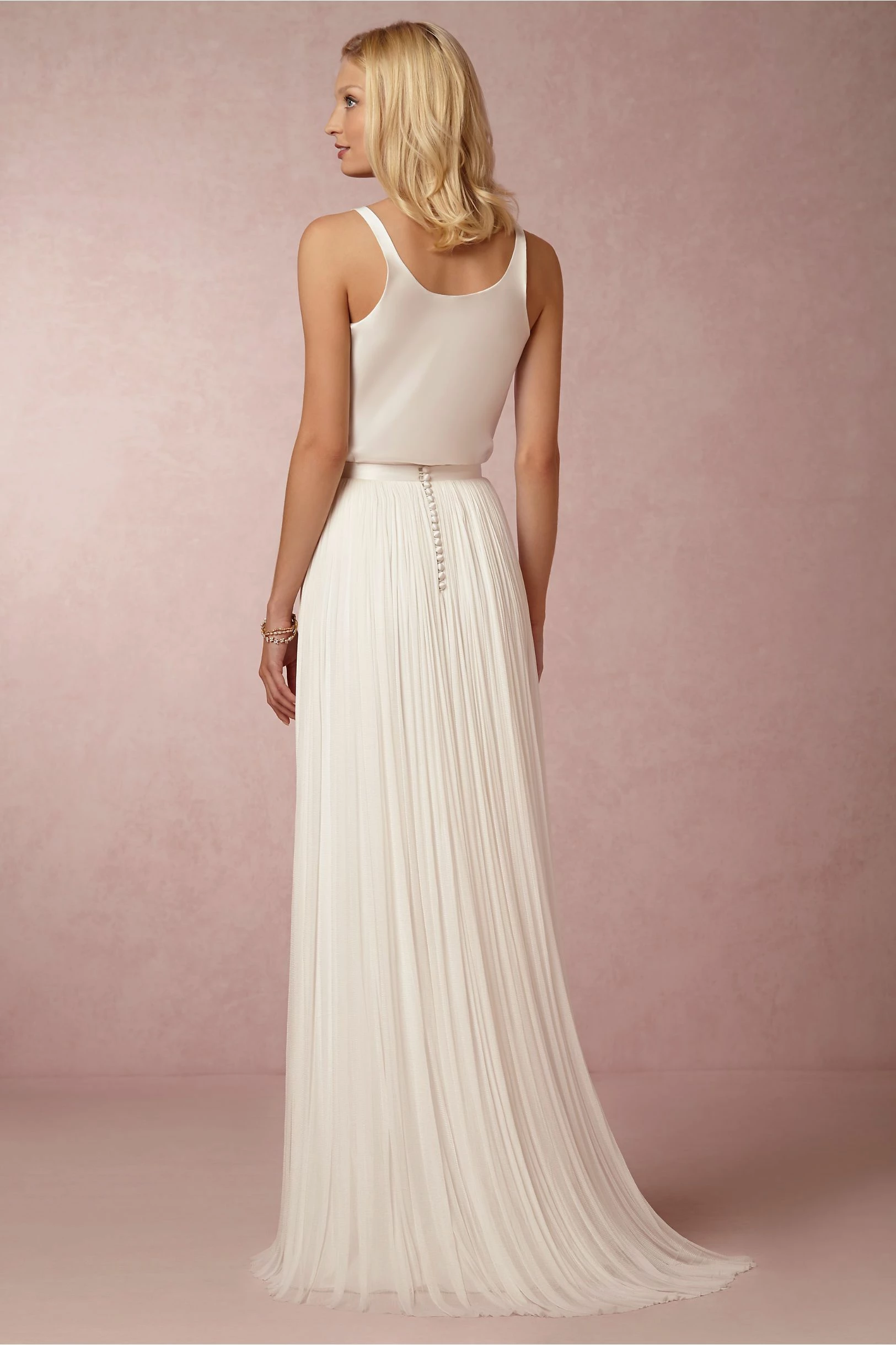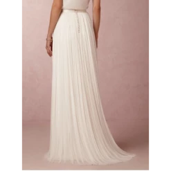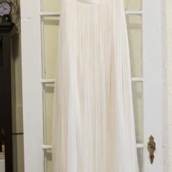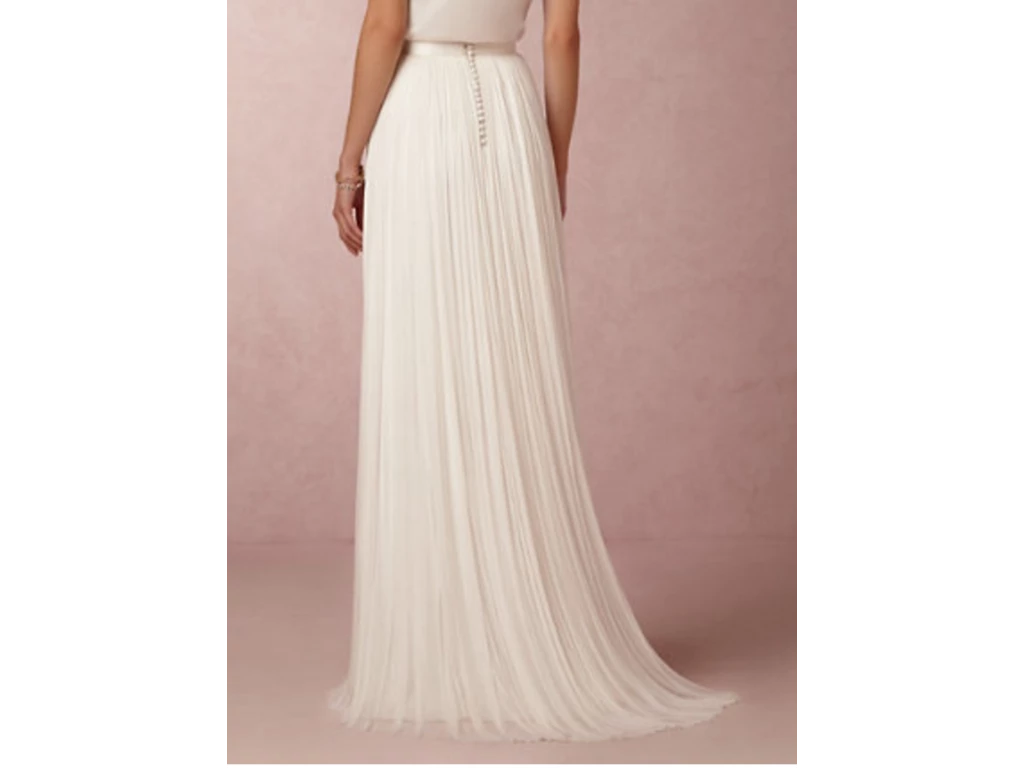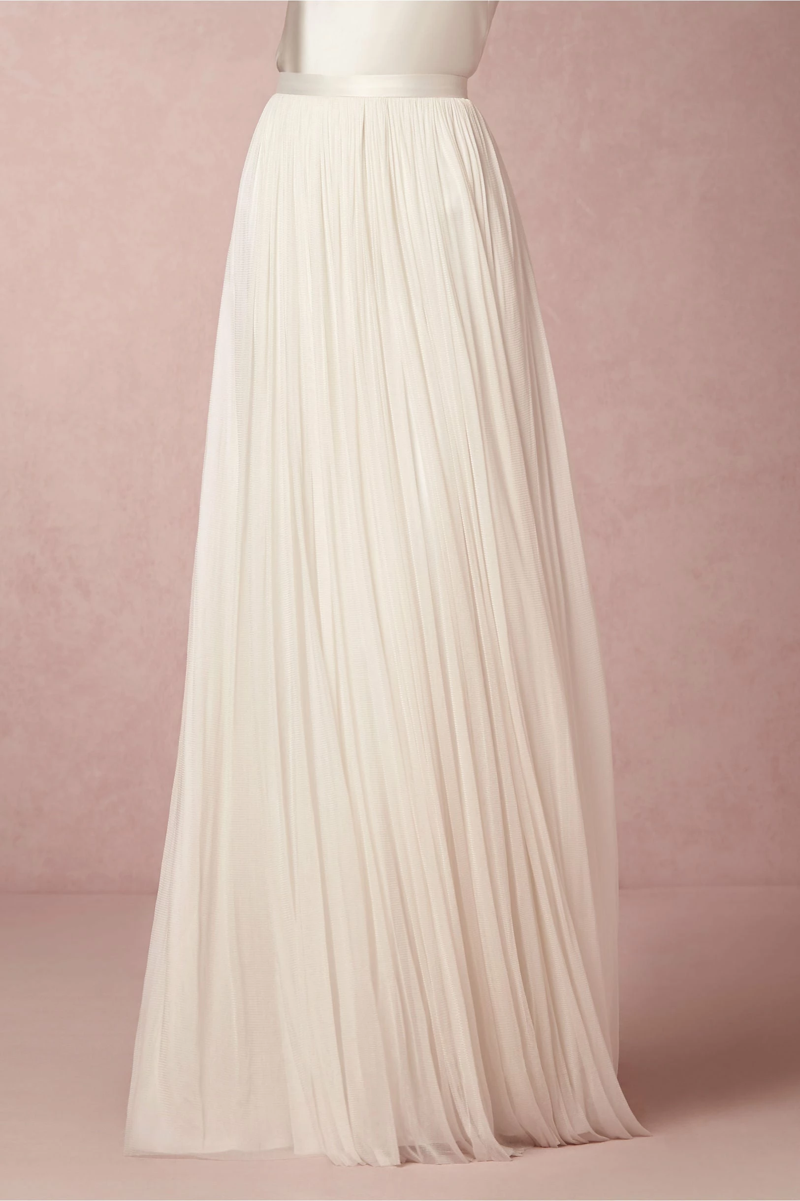 Gracefully pleated ivory silk tulle flows from the satin waistband to the toe-skimming hem of this exquisite skirt.