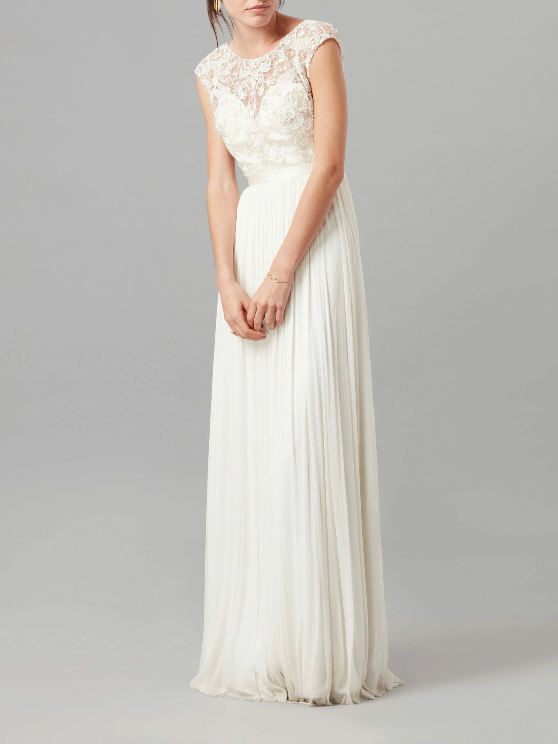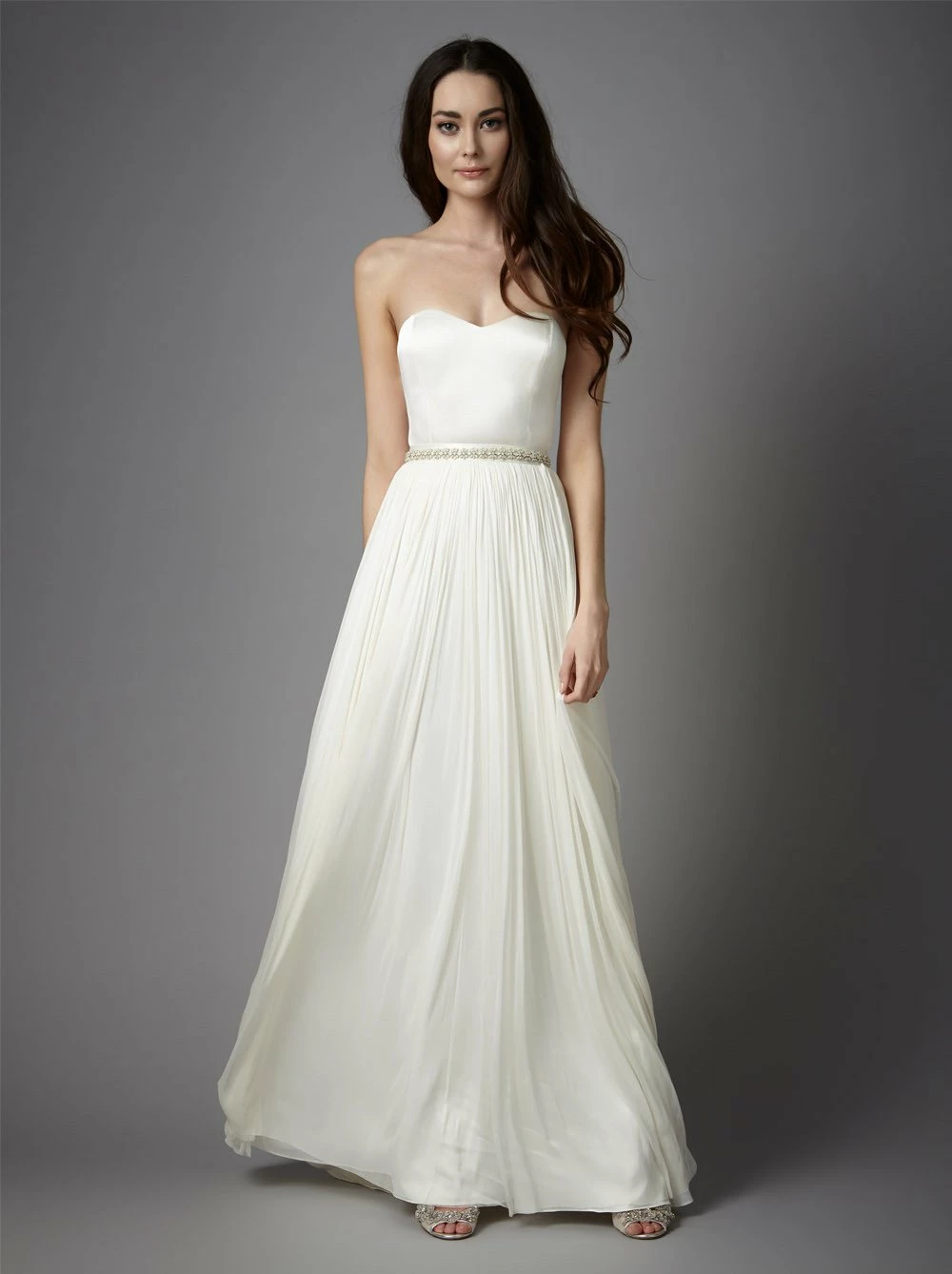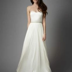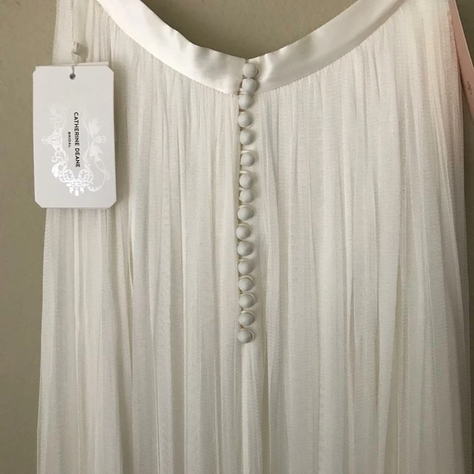 US Size 2 (UK Size 8). Brand new, without tags. May have been tried on in store, but in like-new condition. Very minor wear along the edge of the hemline (not a problem since most brides will need to shorten the skirt). Never worn outside the salon. Retail price: $595.Â