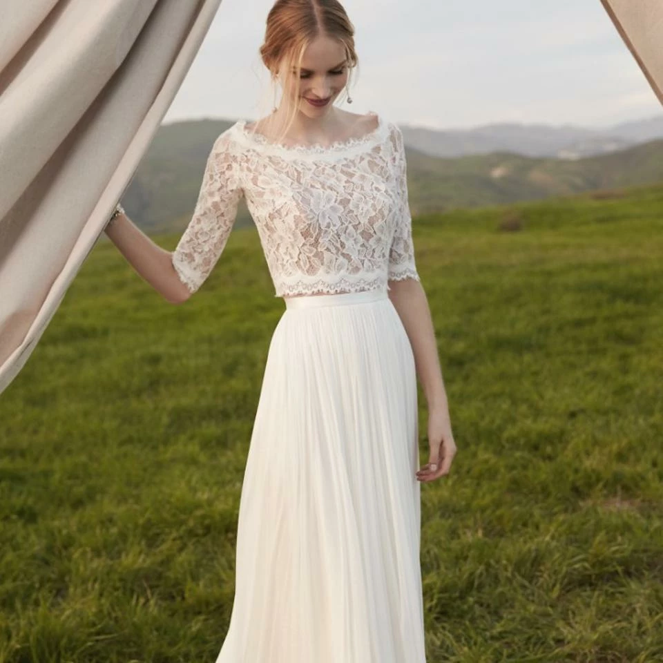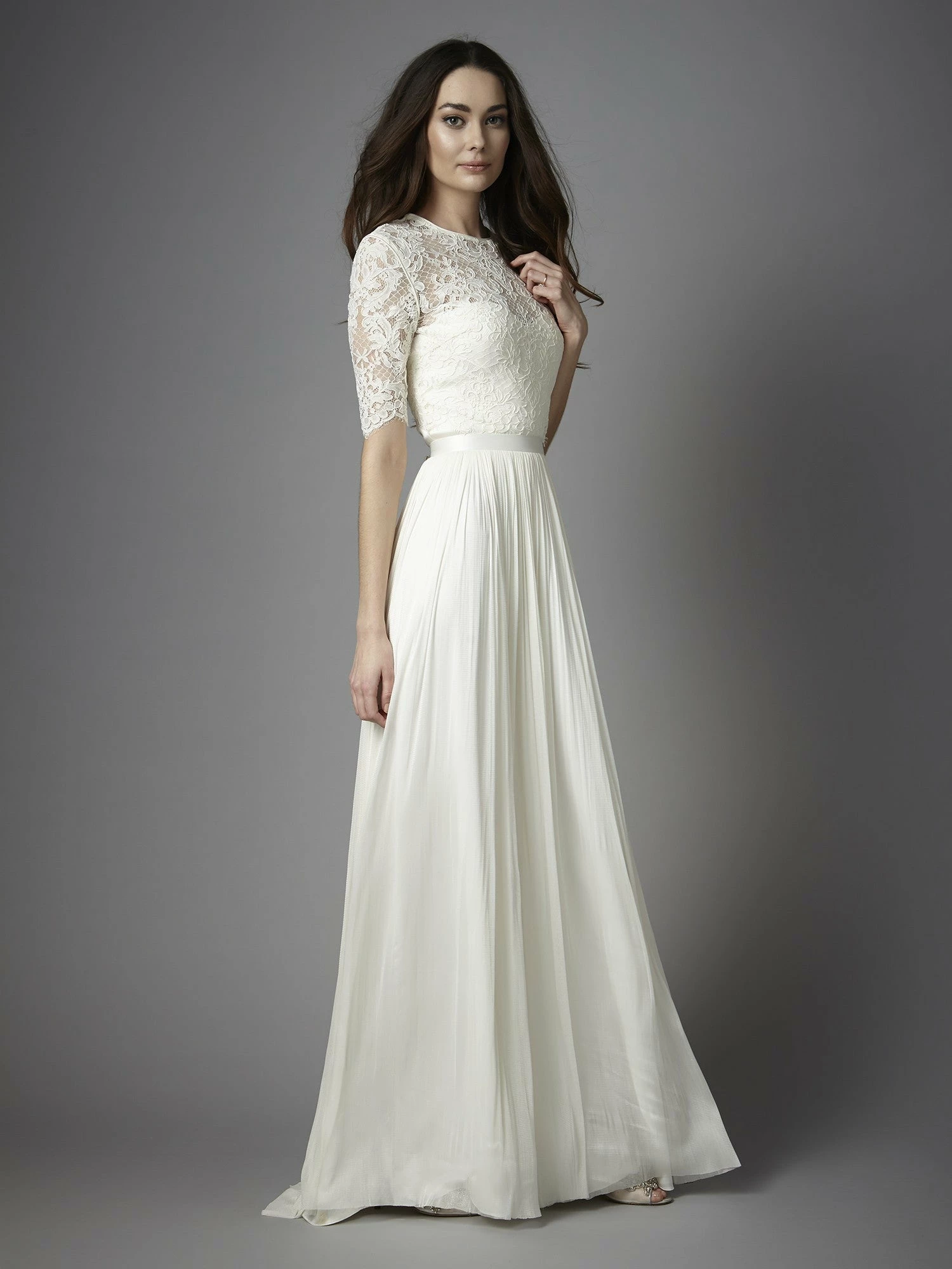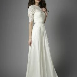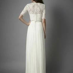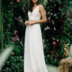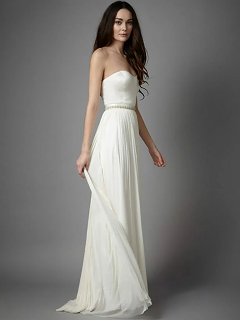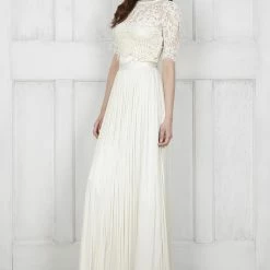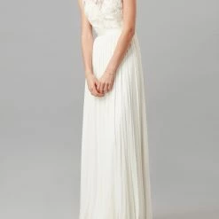 US Size 2 (UK Size 8). Brand new, without tags. May have been tried on in store, but in like-new condition. Very minor wear along the edge of the hemline (not a problem since most brides will need to shorten the skirt). Never worn outside the salon. Retail price: $595.Â