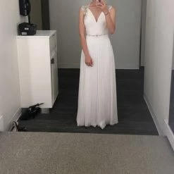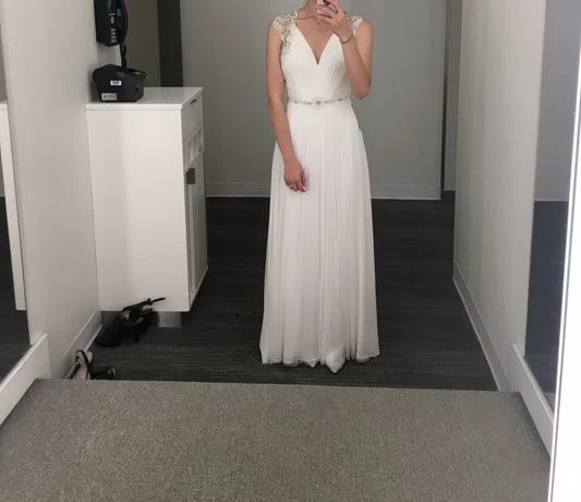US Size 4 (UK Size 8). Brand new, with tags. May have been tried on in store, but in excellent condition. The skirt is a little wrinkled and will need to be steamed before your wedding. Otherwise it’s in excellent condition. Never worn outside the salon and never altered. Retail price: $1,800!