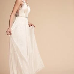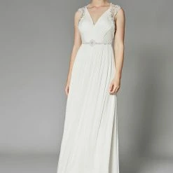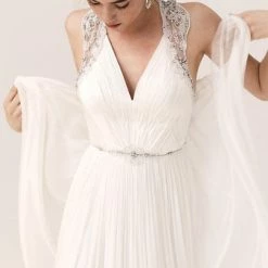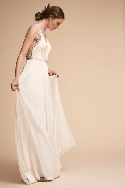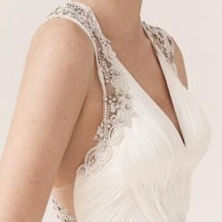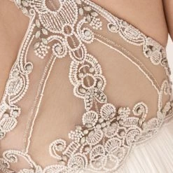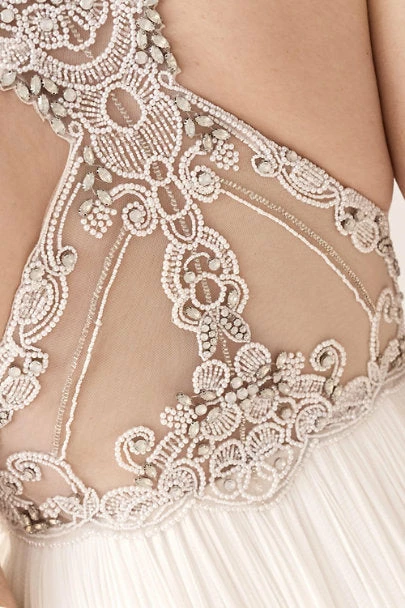 This gown features an ornate crossed back of ivory beading and prong-set crystals hand-sewn on sheer chiffon. A ruched bodice leads to a flowing tulle skirt with subtle pleating at the waist. By Catherine Deane.