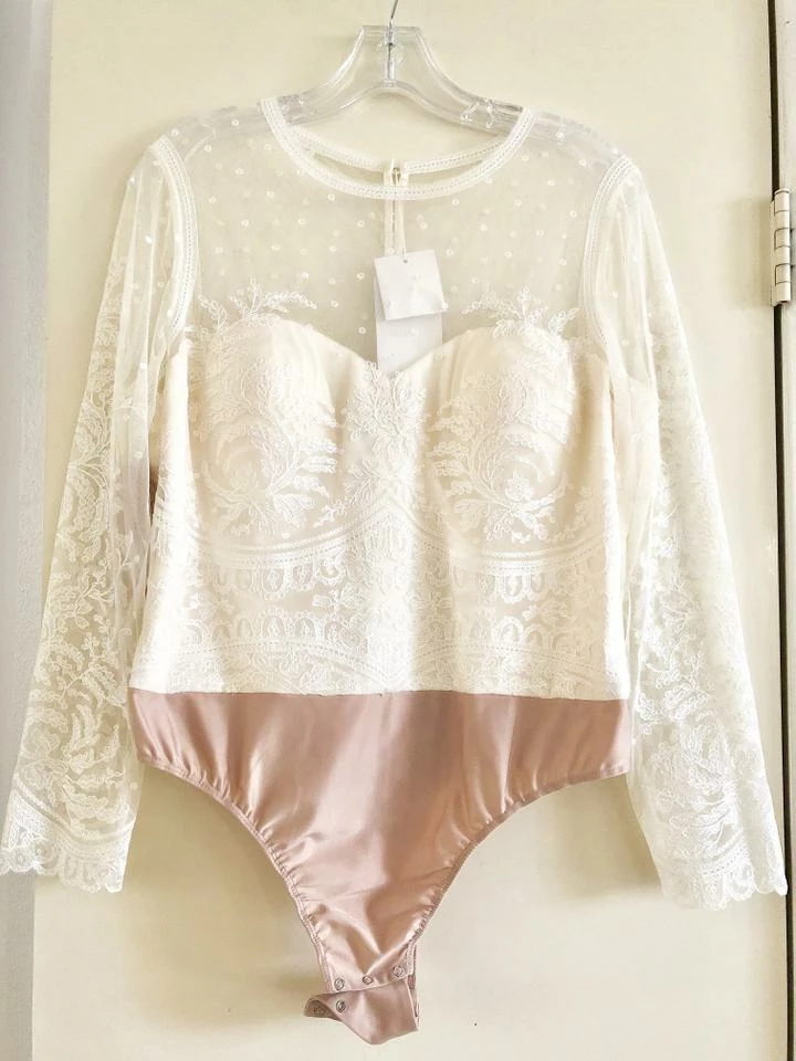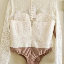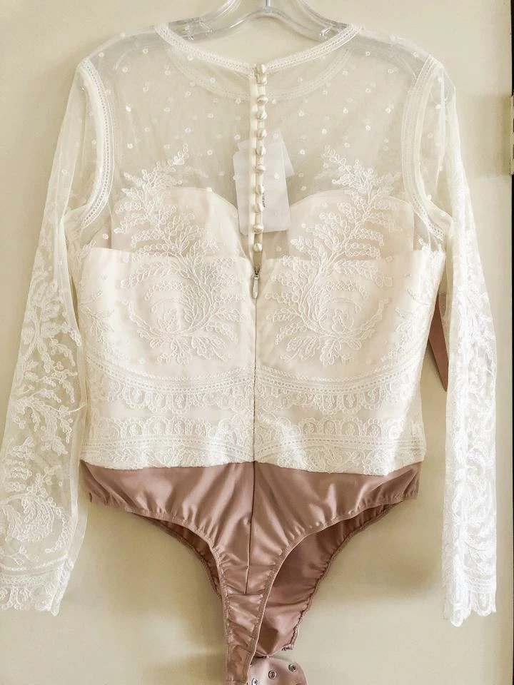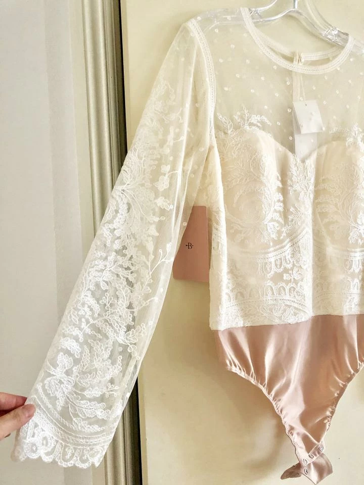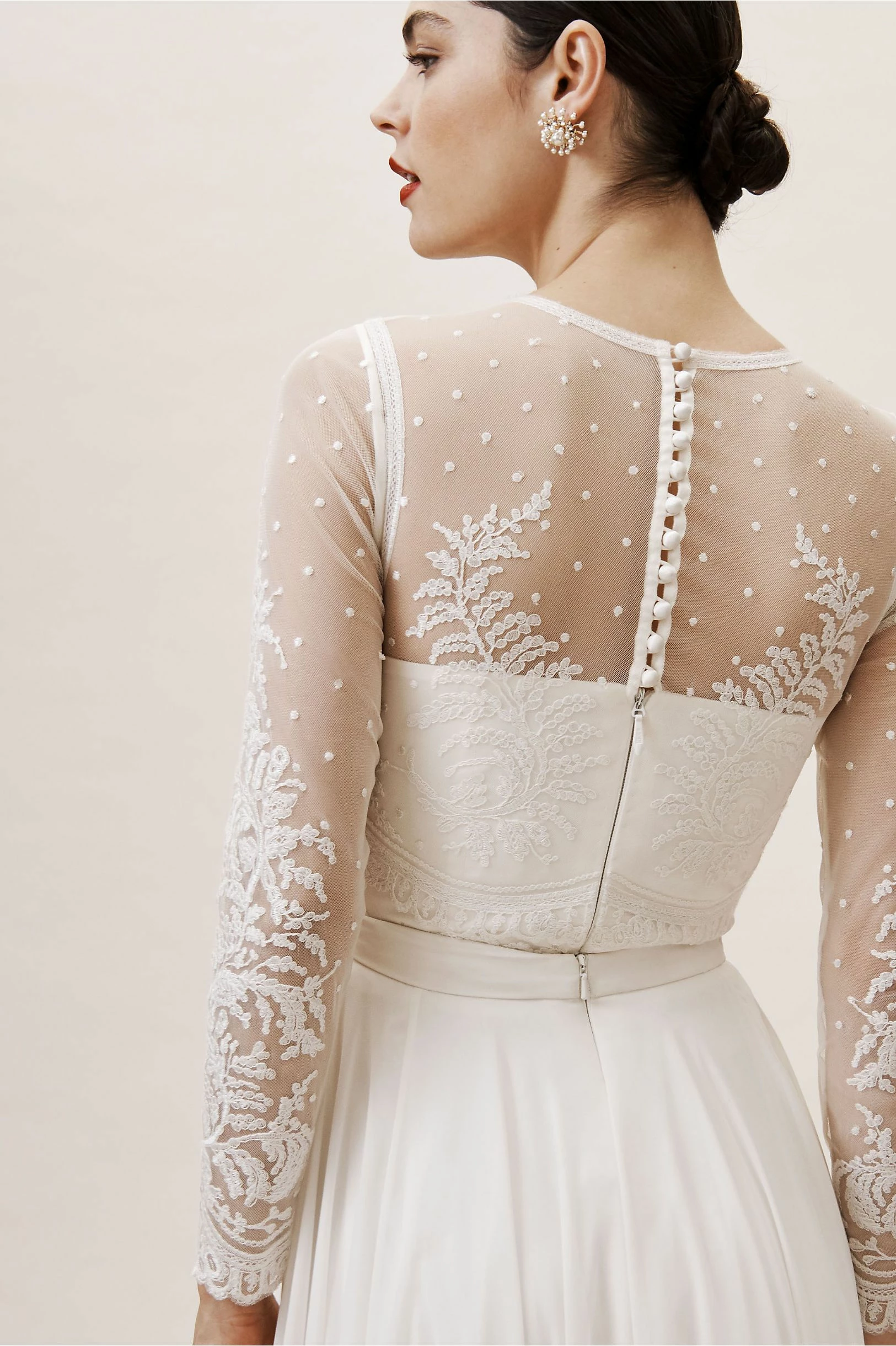 Crafted from ethereal tulle, this long-sleeved bodysuit is embroidered with intricate florals, understated dots, and a delicate trim. The end result is nothing short of regal. By Catherine Deane.Â