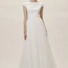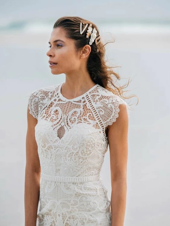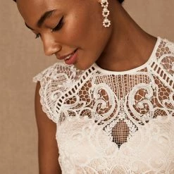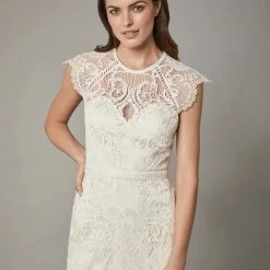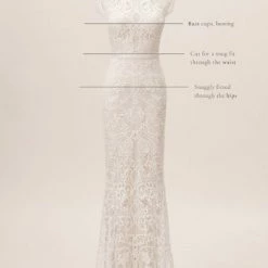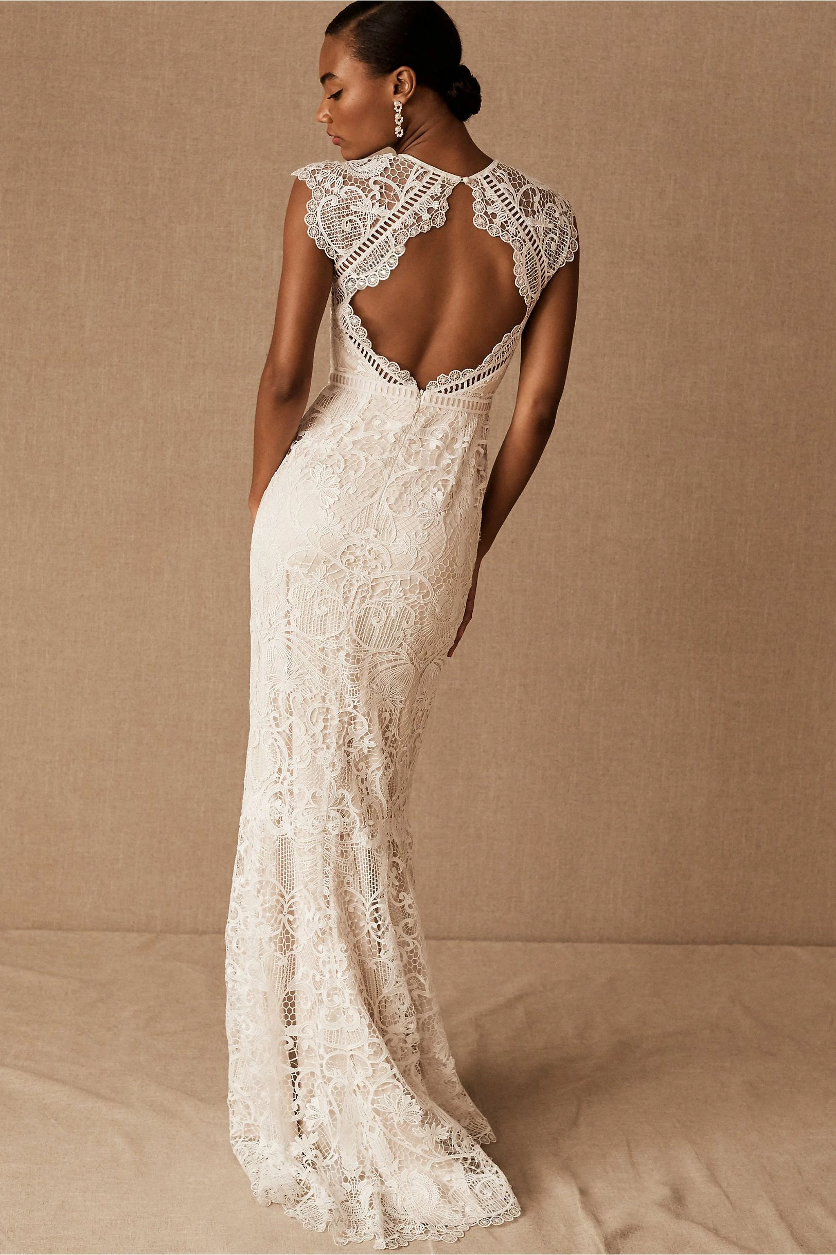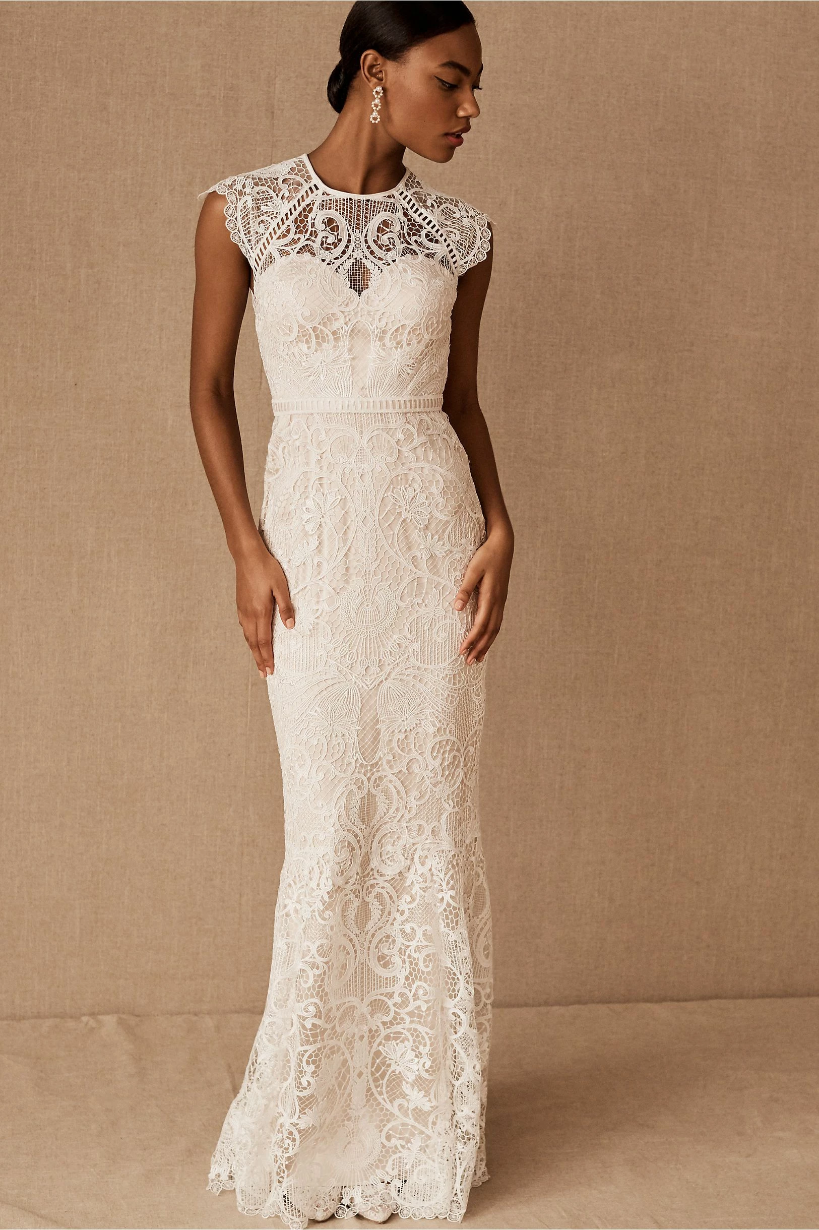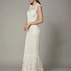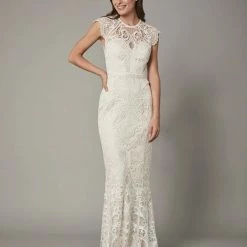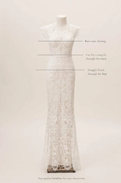 Sheer striking graphic lace curls into a floral brocade pattern that covers the entirety of the Merry Gown and reveals the soft ivory color beneath. Bold ladder trim highlights the waist, cap sleeves and keyhole open back, while delicate circles line the gown and add an unconventional twist to the subtle train.