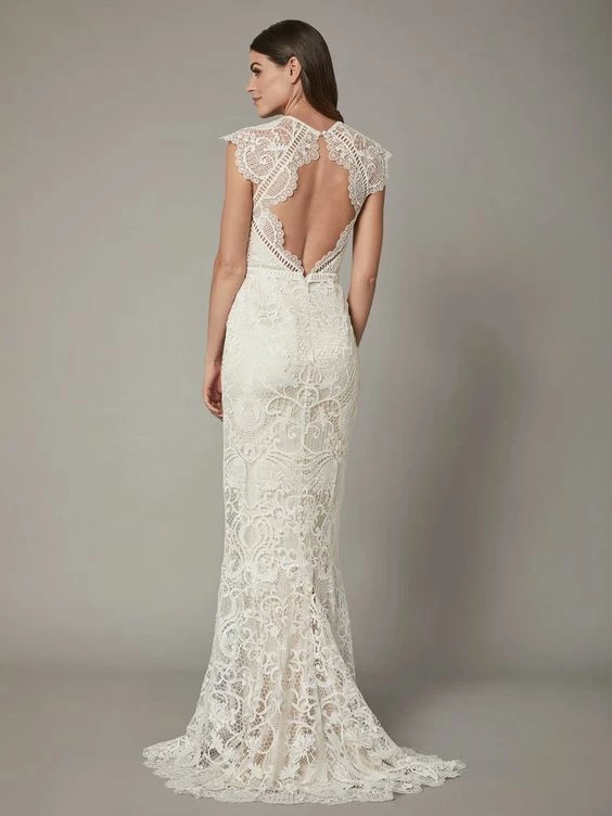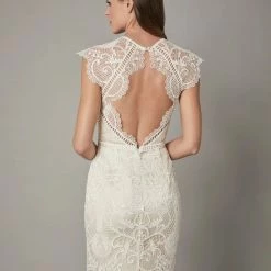 Fitted through the bodice and hips for a feminine silhouette, this column gown is finished with delicate short sleeves. Graphic lace frames the face, leading to a dramatic open back. By Catherine Deane.