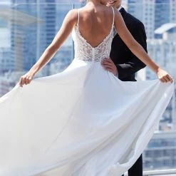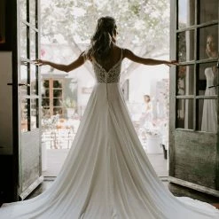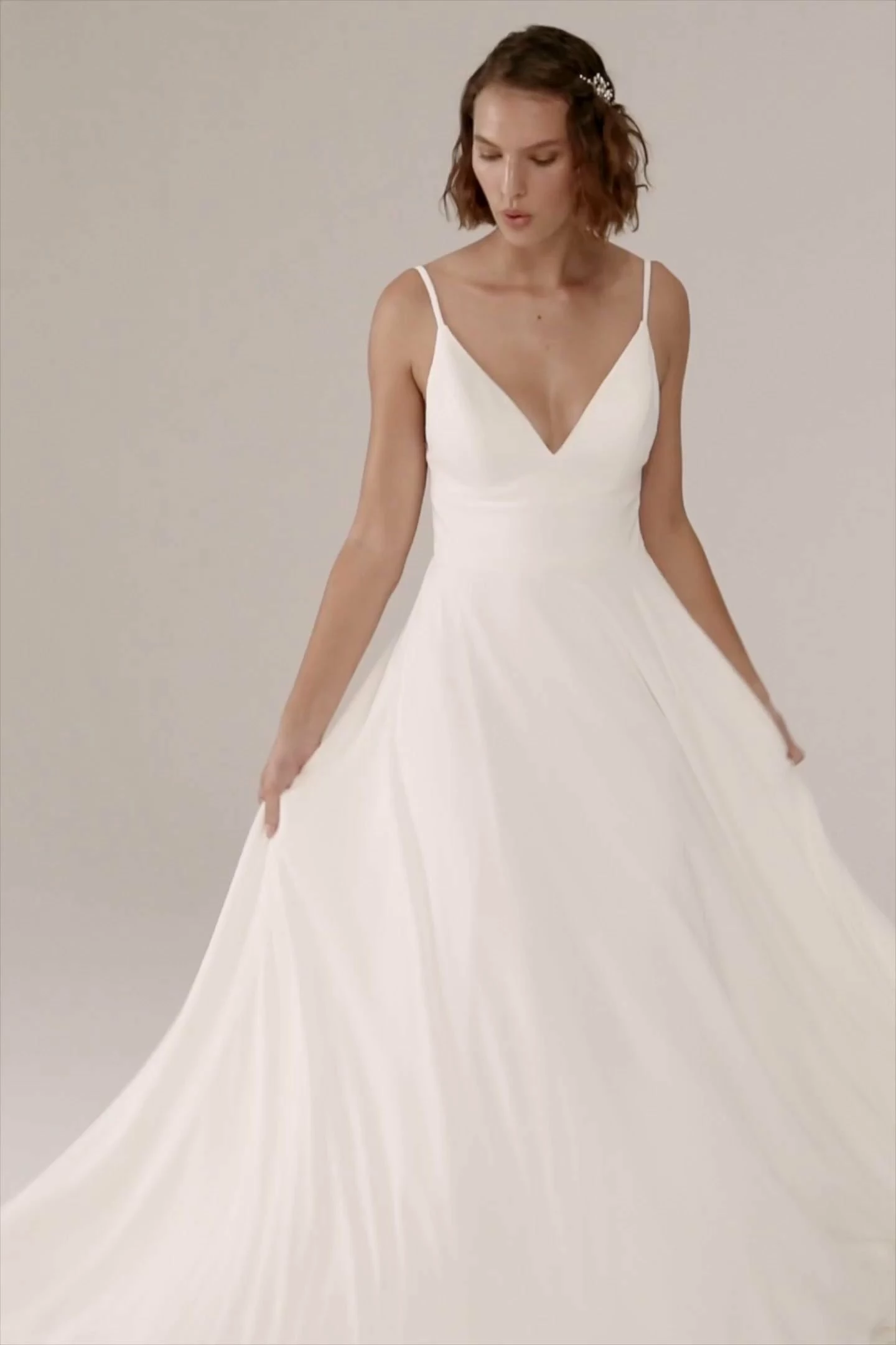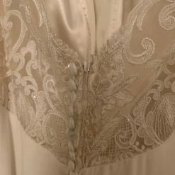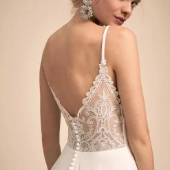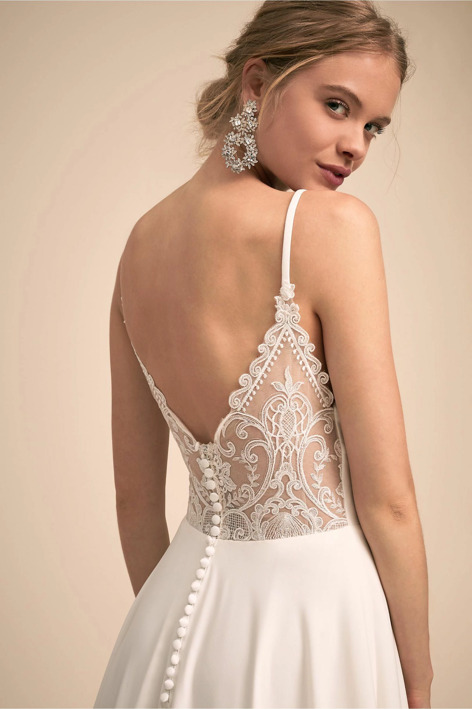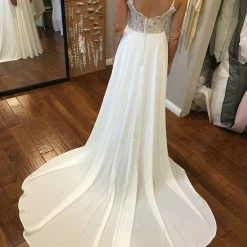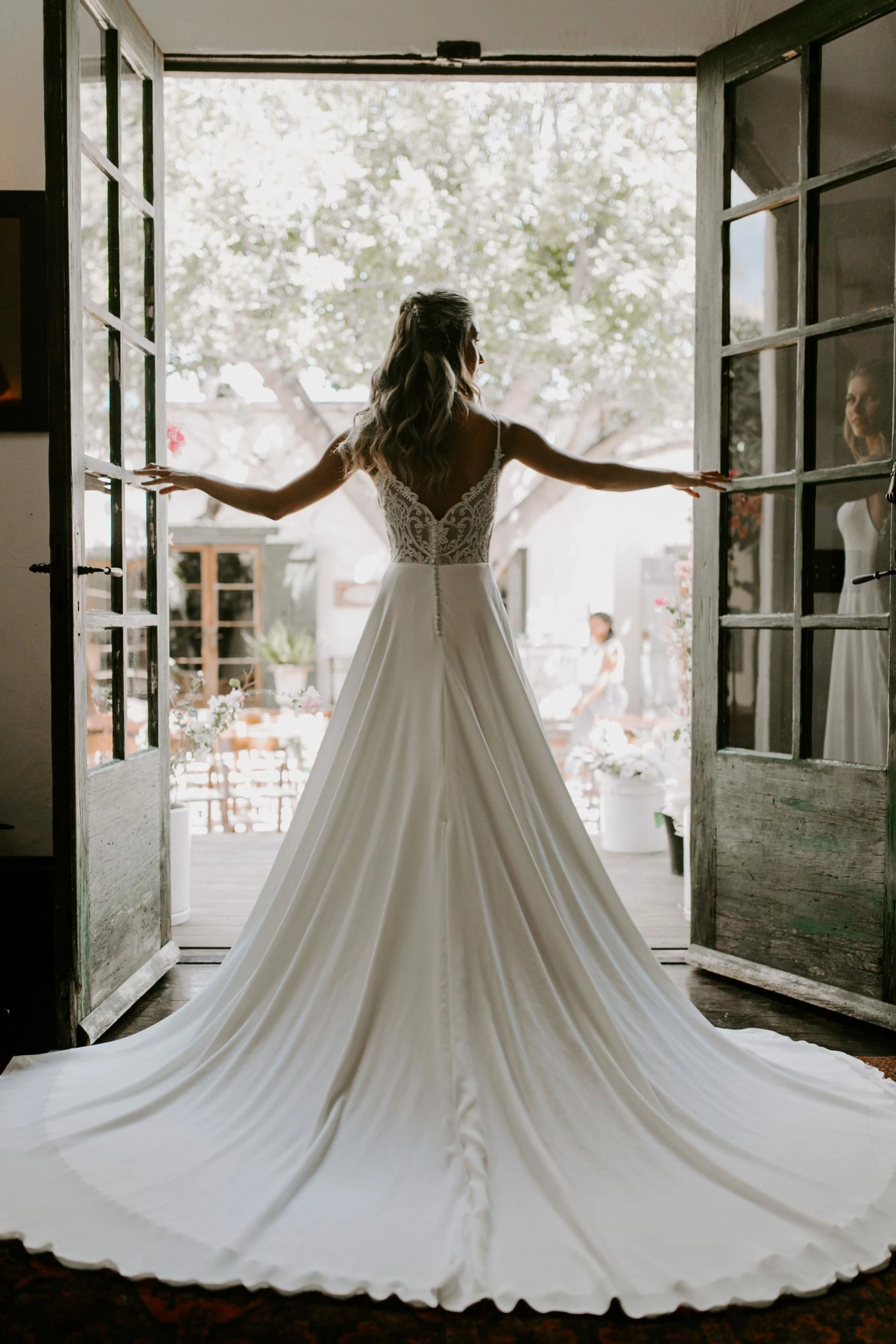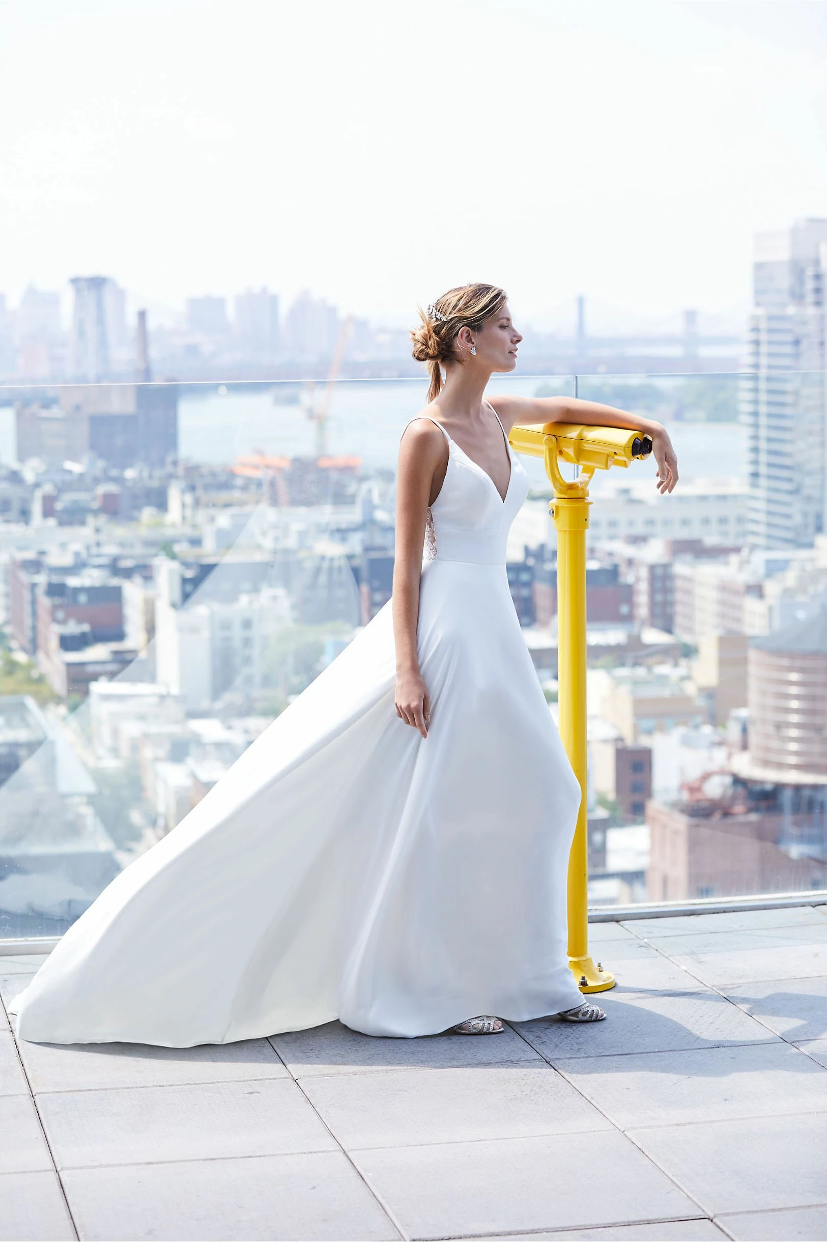 The crisp v-neck front of this gown gives way to a sheer lace back and dramatic train. By Eddy K.