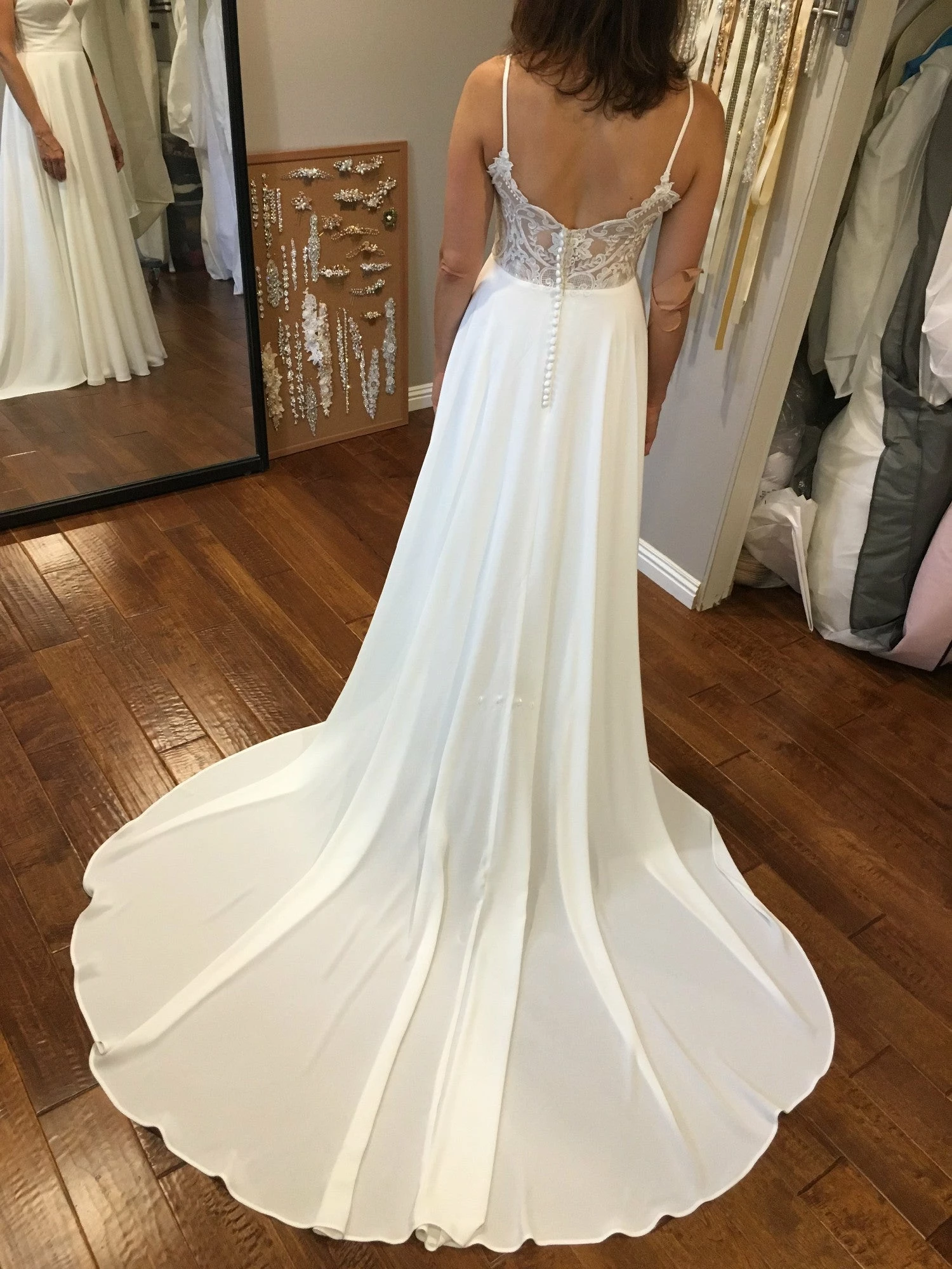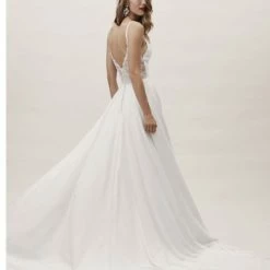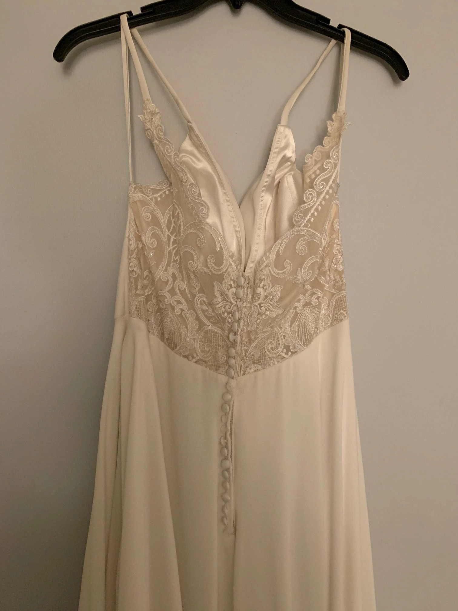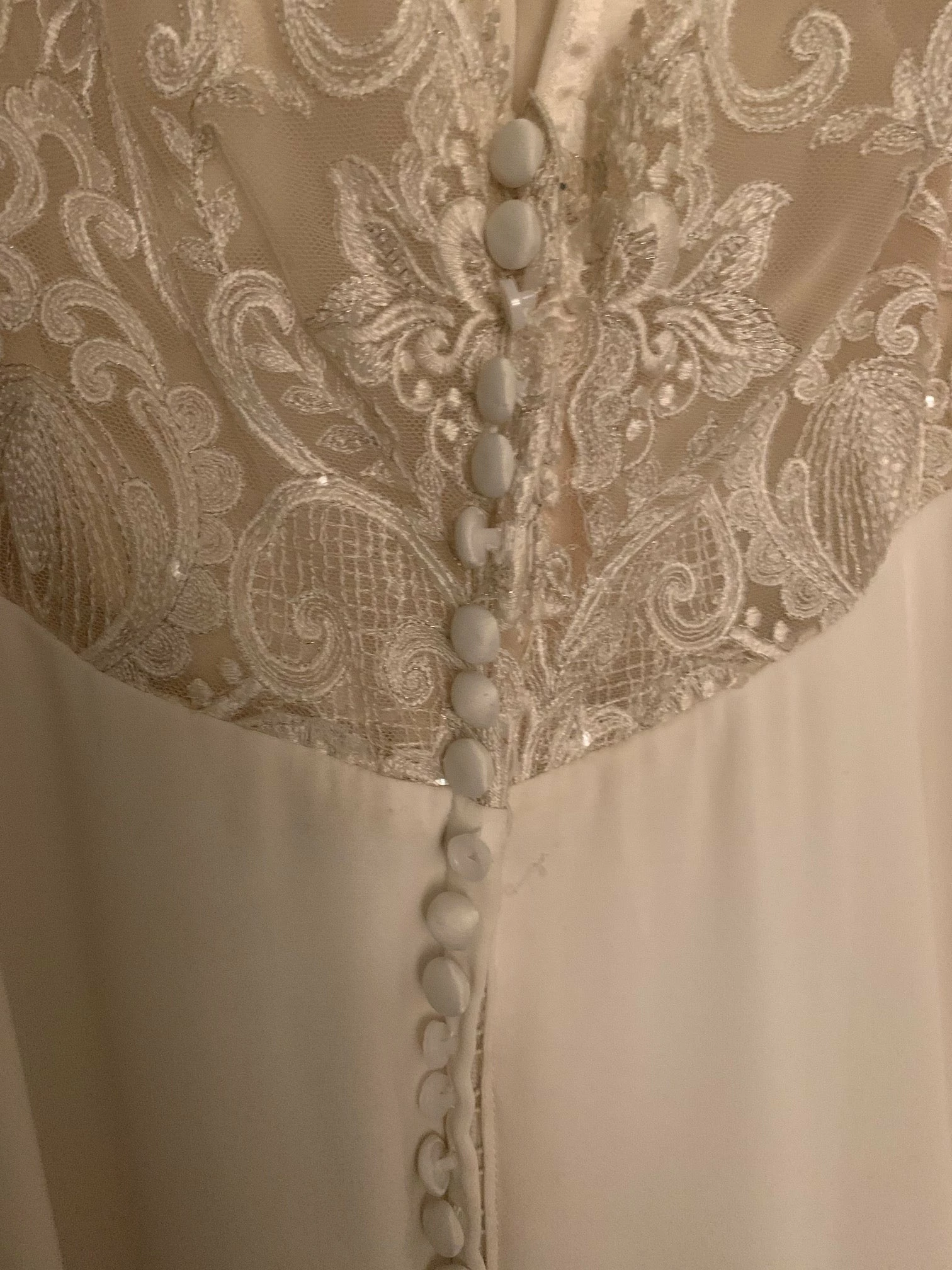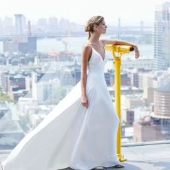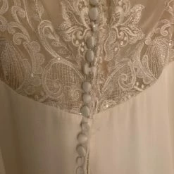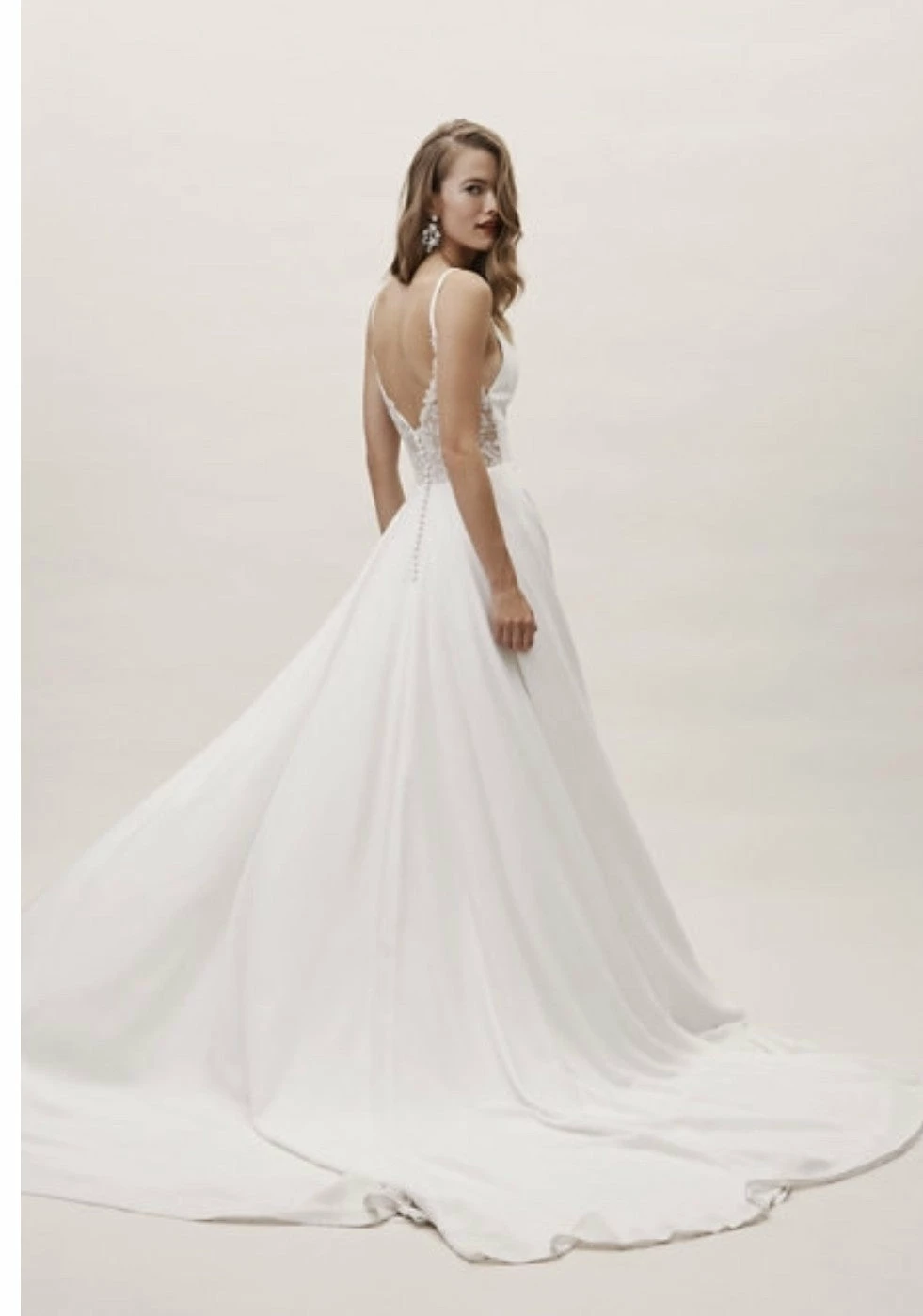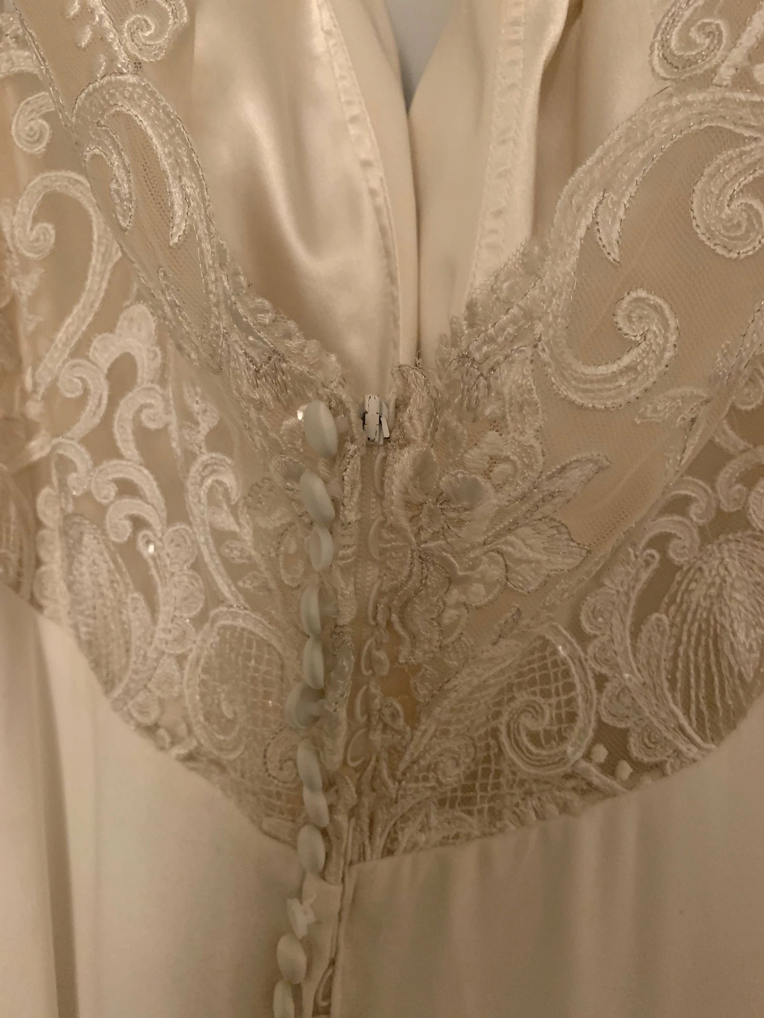 The crisp v-neck front of this gown gives way to a sheer lace back and dramatic train. By Eddy K.