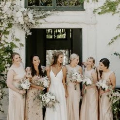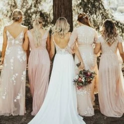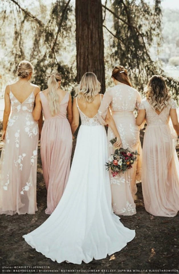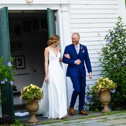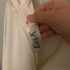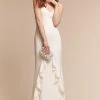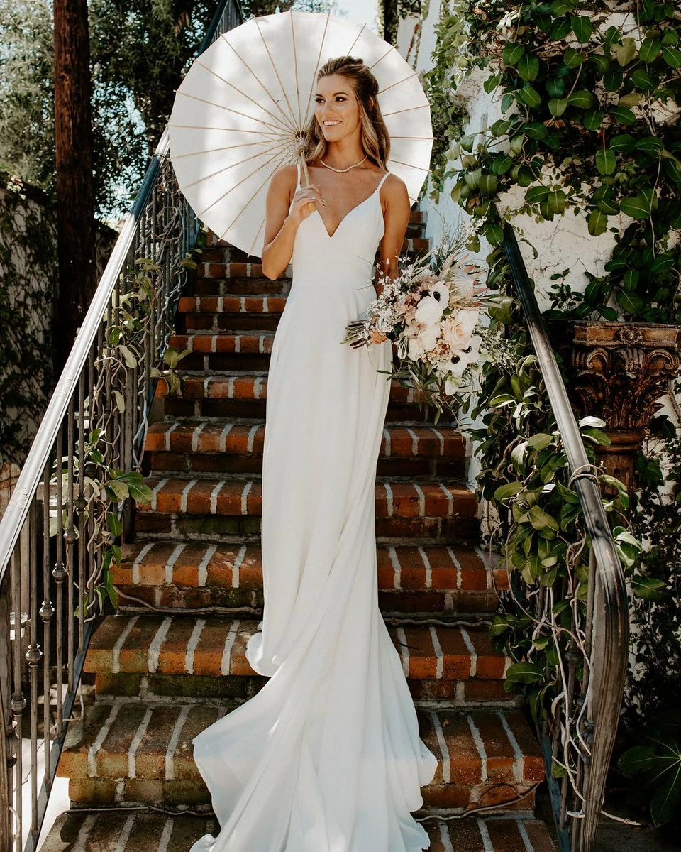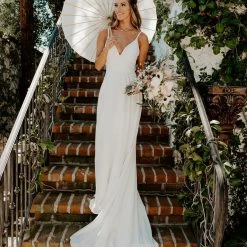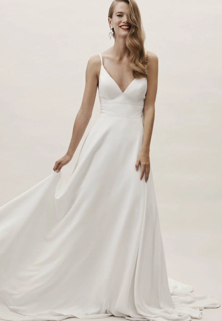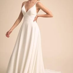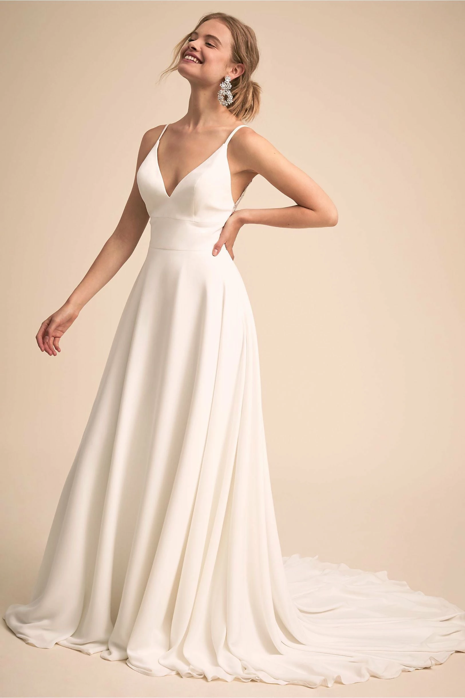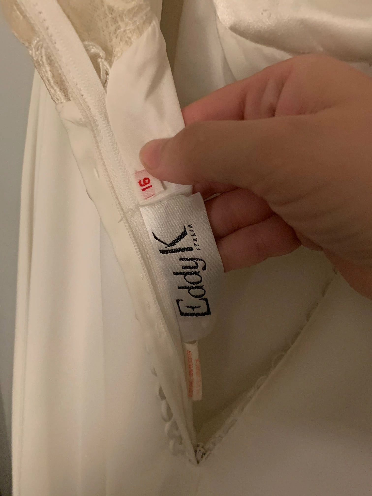 The crisp v-neck front of this gown gives way to a sheer lace back and dramatic train. By Eddy K.