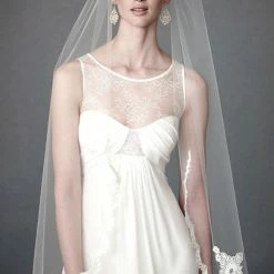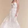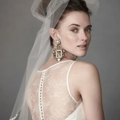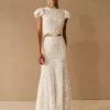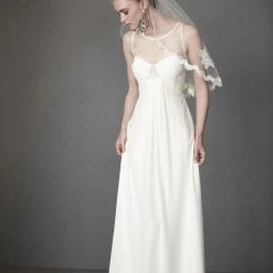 Walking the line between traditional and modern almost perfectly, Essere reinterprets all of the usual elements. French lace picks up where finely pleated cups leave off—scooping just below the collar bone, up and over the shoulders, and alongside a line of shank buttons down the back before finally stopping at the sash (just as beautiful bow-tied as it is left to hang loose) and double lined silk skirt with mini train.Â