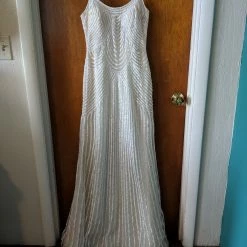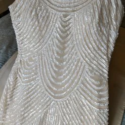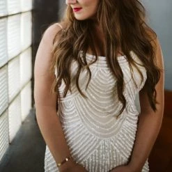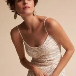 Hundreds of petite sequins are meticulously hand-sewn in linear Art Deco patterns on an overlay of wispy tulle. The effect is brilliant; they capture light as you move and bring intricate texture to this sleek design. Thin embellished straps and a scoop back make a sophisticated statement.Â