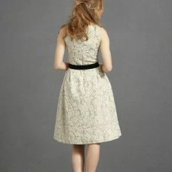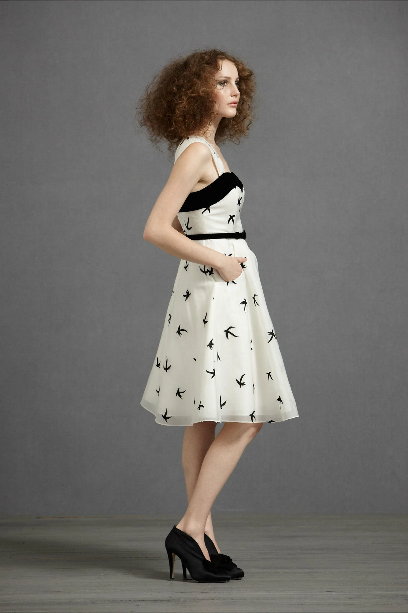Velvet birds glide and swoop in a misty organza sky on Hitherto’s pocketed, fit-and-flare number.