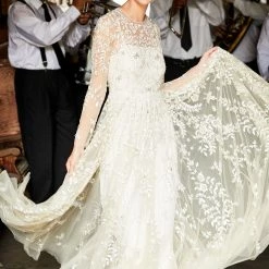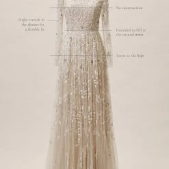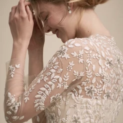 Champagne tulle gives a lit-from-within glow to this stunning gown, featuring an illusion neckline and sheer sleeves. The ivory embroidery is embellished with tiny silver beads for added sparkle. By BHLDN.