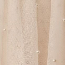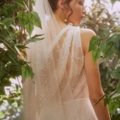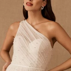 Studded with pearls for allover shimmer, this A-line gown is made from delicate netting atop a soft cashmere lining. An asymmetric neckline and dramatic open back pair with a full skirt. Pearl-studded tulle mimics the look of stardust. By Hayley Paige.