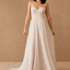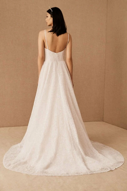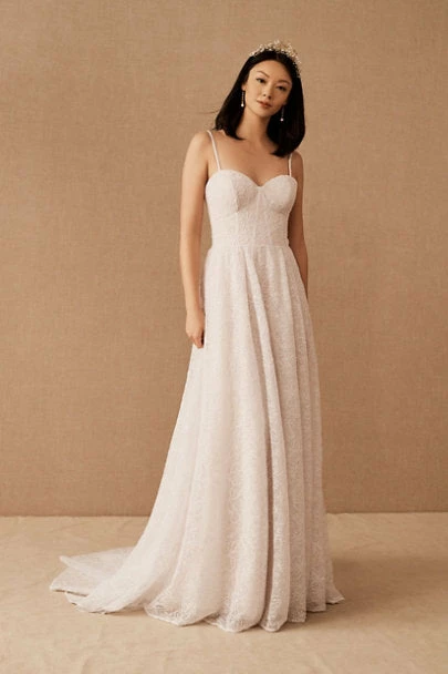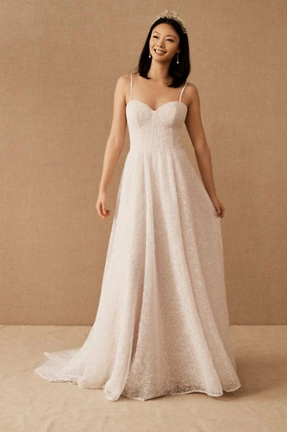 Swathed in allover corded lace, this A-line gown features a corset bodice, sweetheart neckline, and sweeping skirt.
