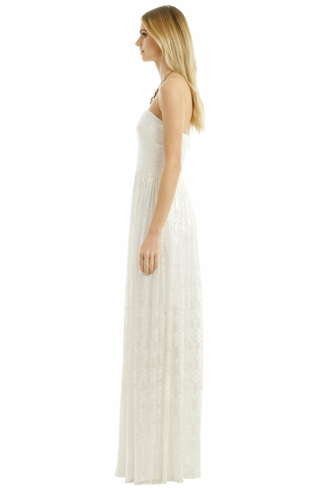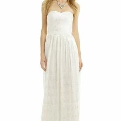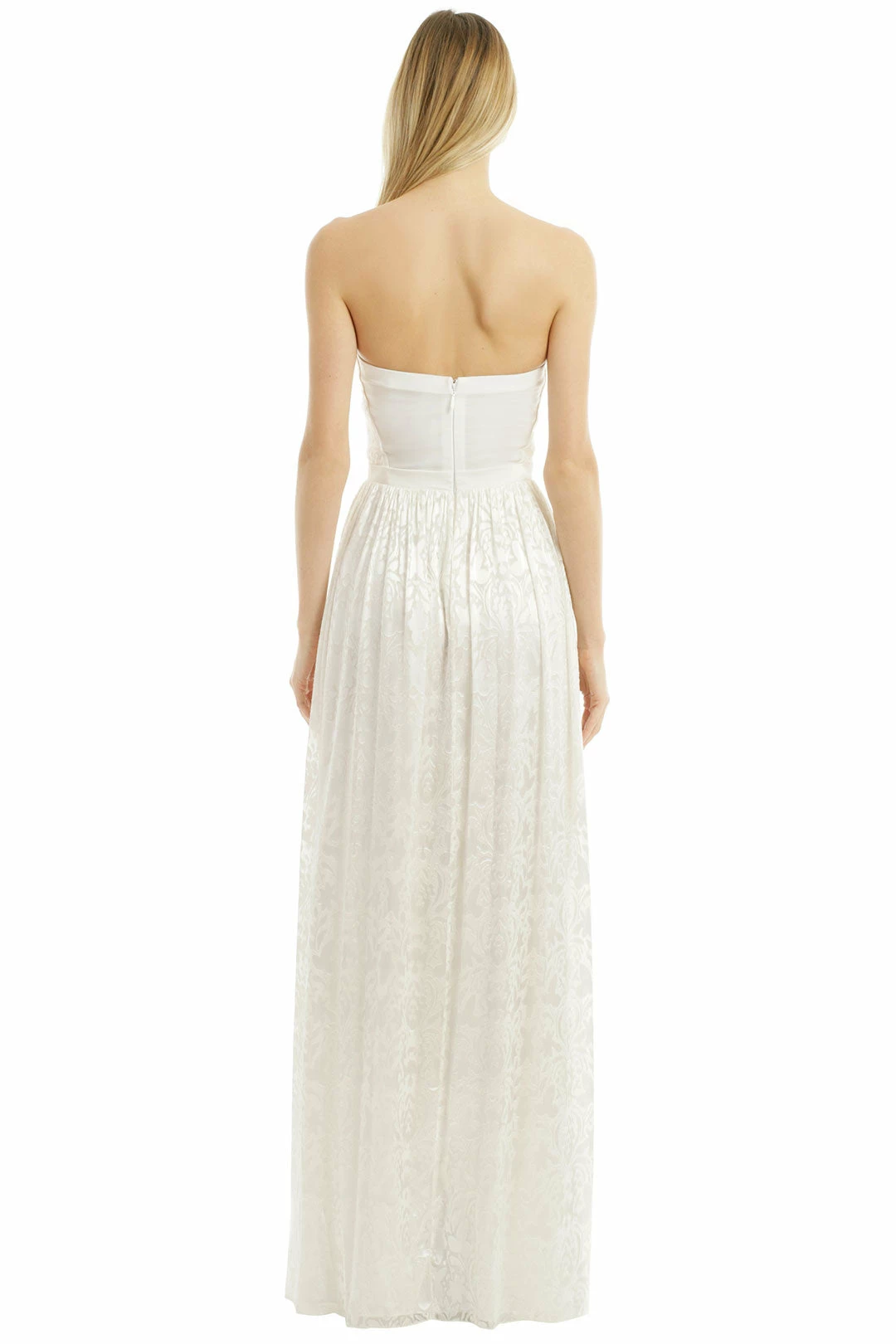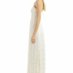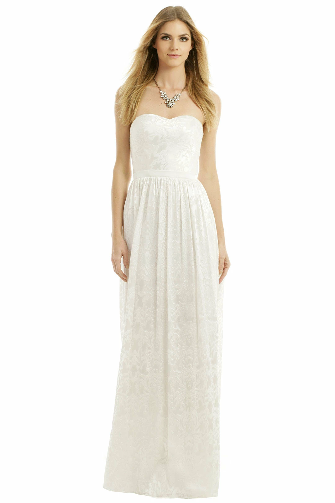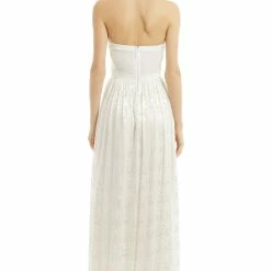 Inspired by a garden bursting with blooms, we love the unique floral burnout pattern and sheer back panel on this floor-skimming dress from Erin Fetherston.  Make a stunning statement in this gown by ERIN Erin Fetherston. The burnout texture in stark white will flow beautifully through the event – great for a beach bride!