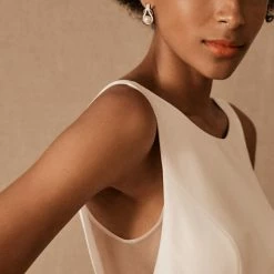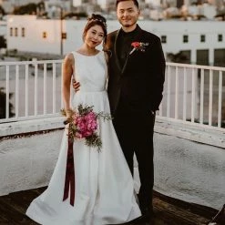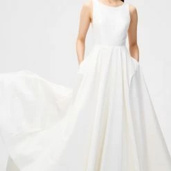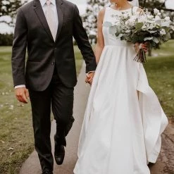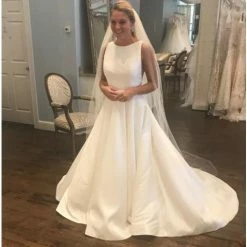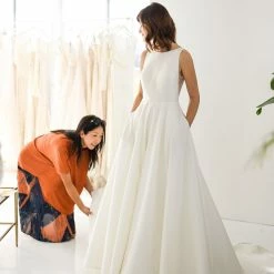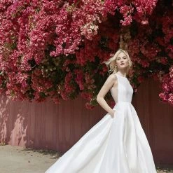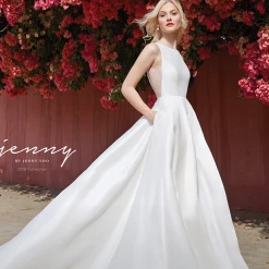 The Ashton gown from Jenny by Jenny Yoo features an elegant modified boat neck, balanced by a plunging deep V in the back and illusion sides that draw attention to the smallest part of the waist. The full circle skirt is dramatic yet lightweight and has functional pockets, adding a playful feel. This gown is fully lined with a center back zipper. A chic high neckline lends a modern edge to the 50s-inspired silhouette of this taffeta gown. The full A-line skirt (with pockets!) extends into a sweeping train.