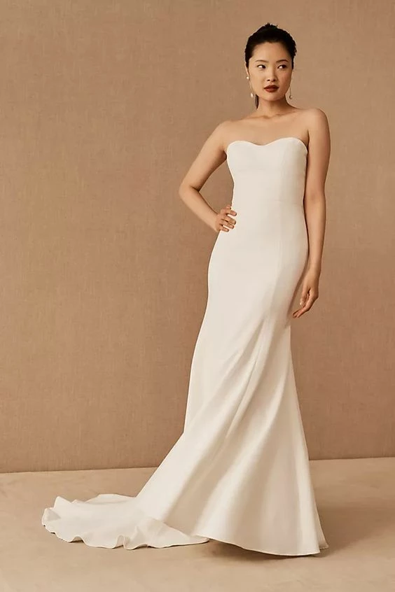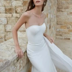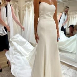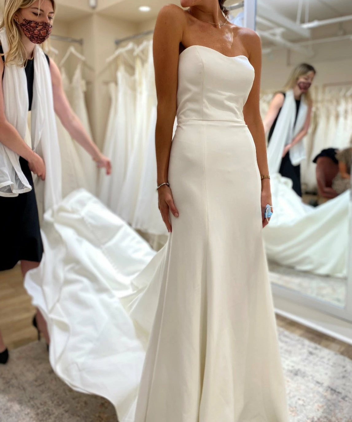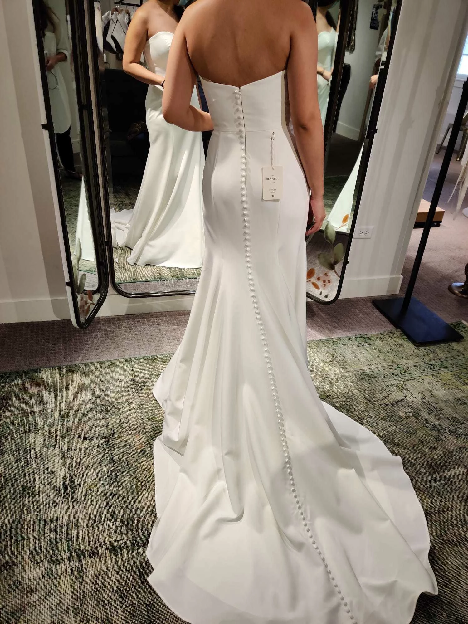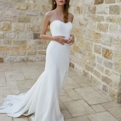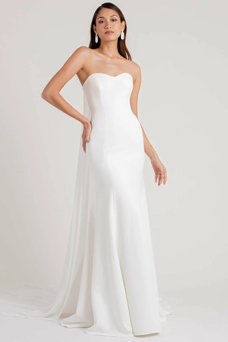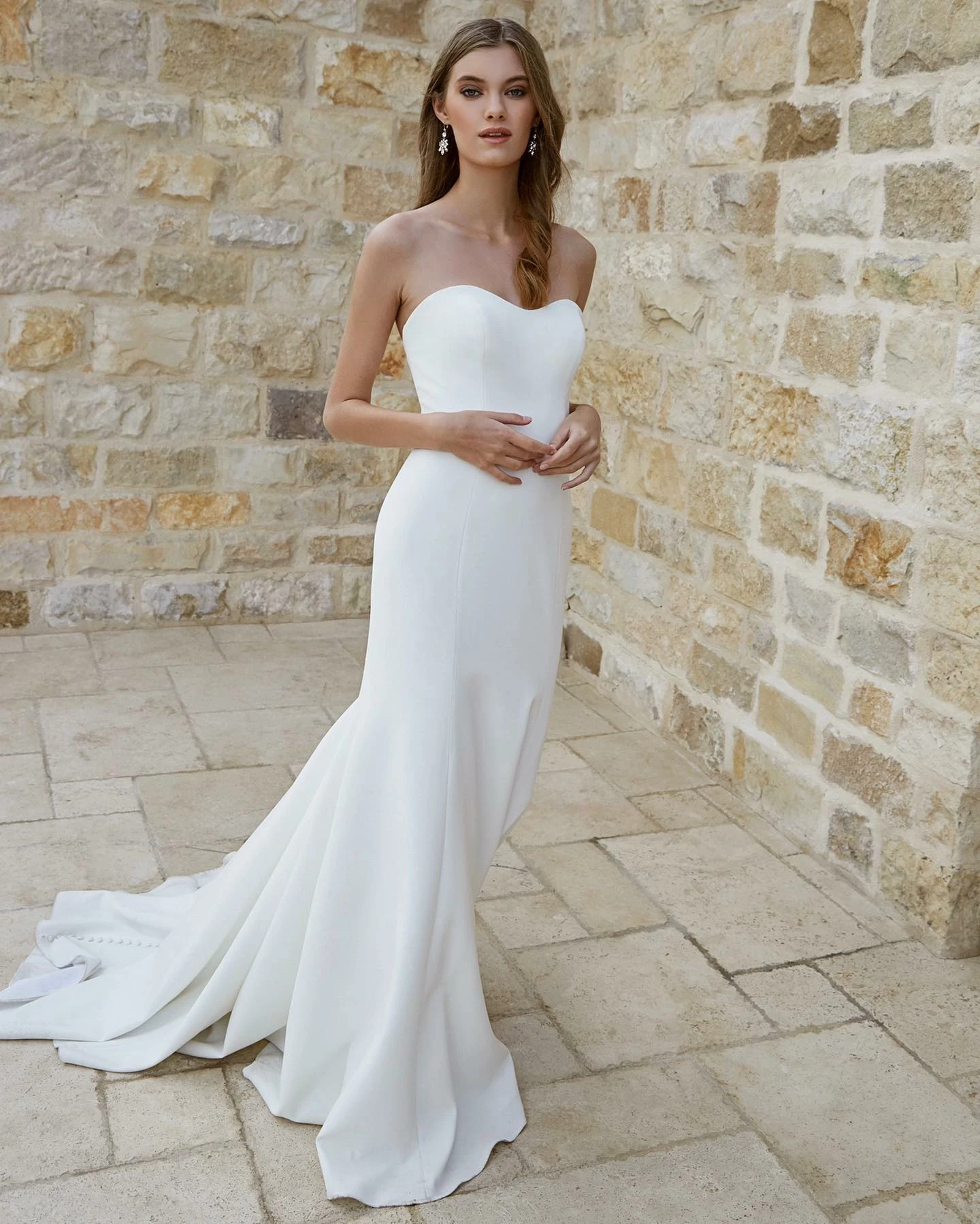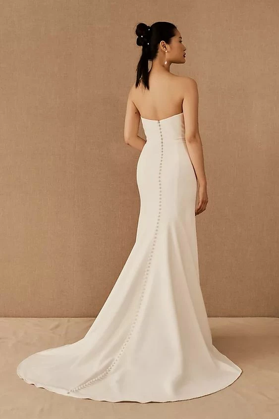 Flawlessly fitted, this matte crepe gown is a stunning pick for the modern bride. A timeless sweetheart neckline finishes the strapless bodice, while covered buttons accentuate the sweeping train. The Bennett’s matte crepe sculpts and cinches in all the right places.