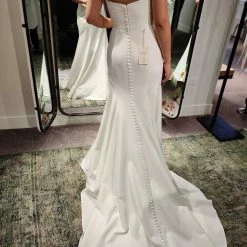 Size 0 & 2. This gown has been tried on in store and has minor dust along the hemline. Not an issue since most brides have to shorten the dress. Other than the hemline, the dress is in perfect condition! Current style. Retail price: $995.