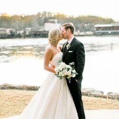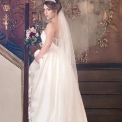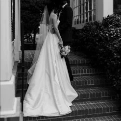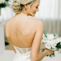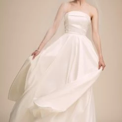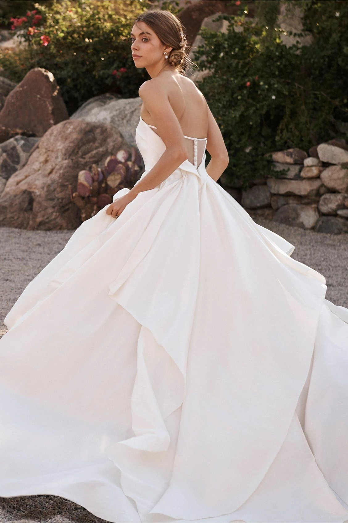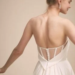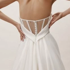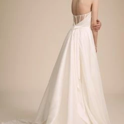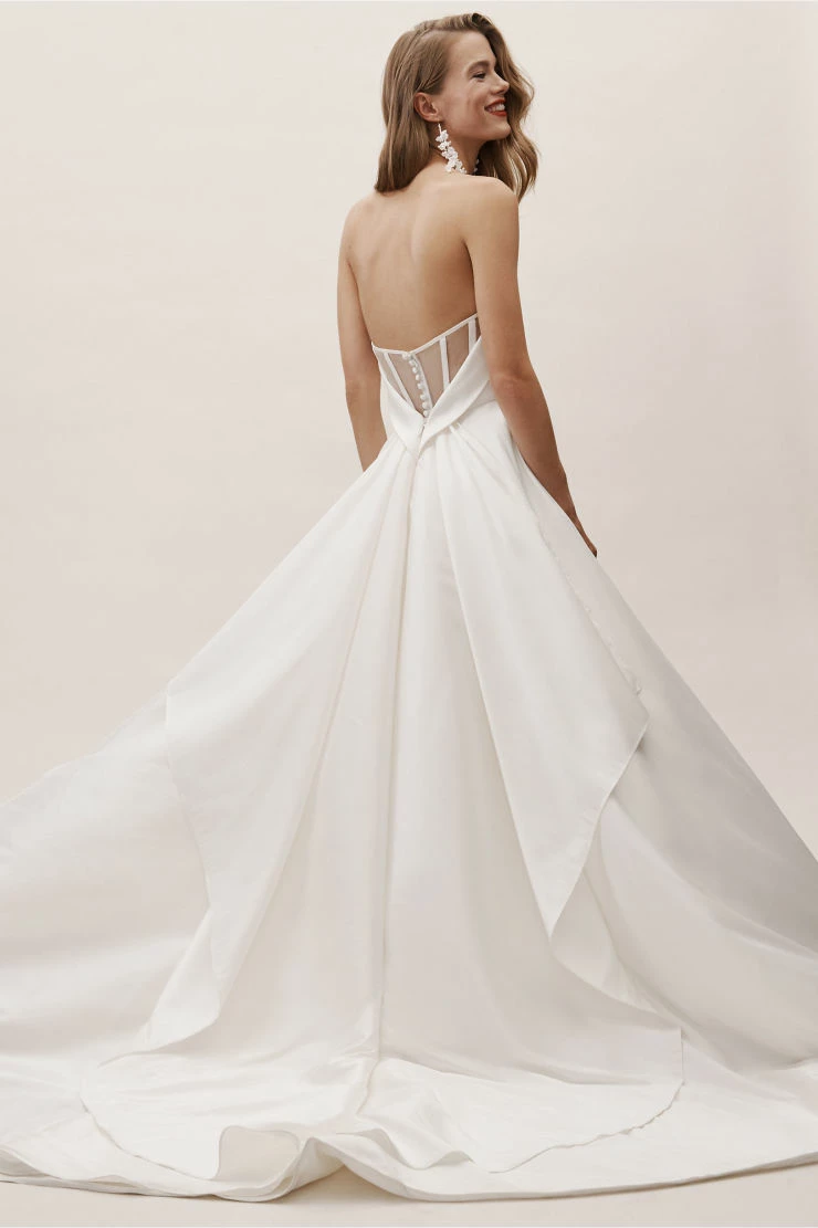 A modern and daring exposed corset adds a sultry touch to this classic strapless ballgown, crafted from luminous ivory taffeta. By Jenny Yoo. Â